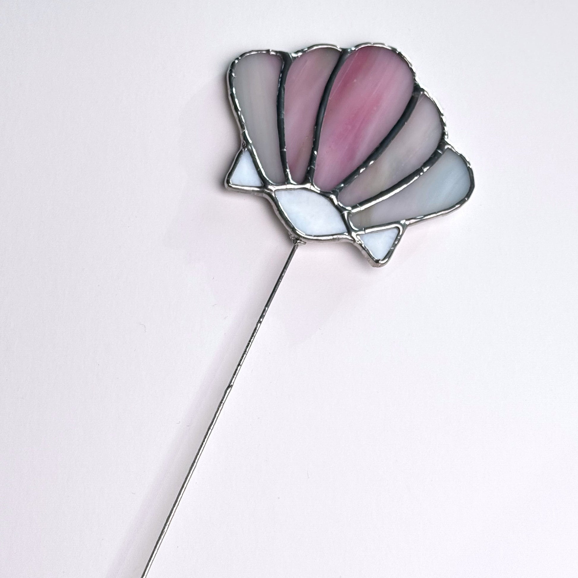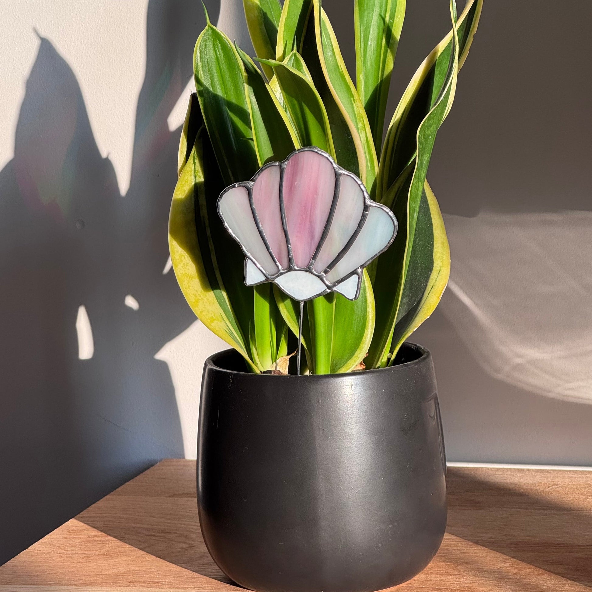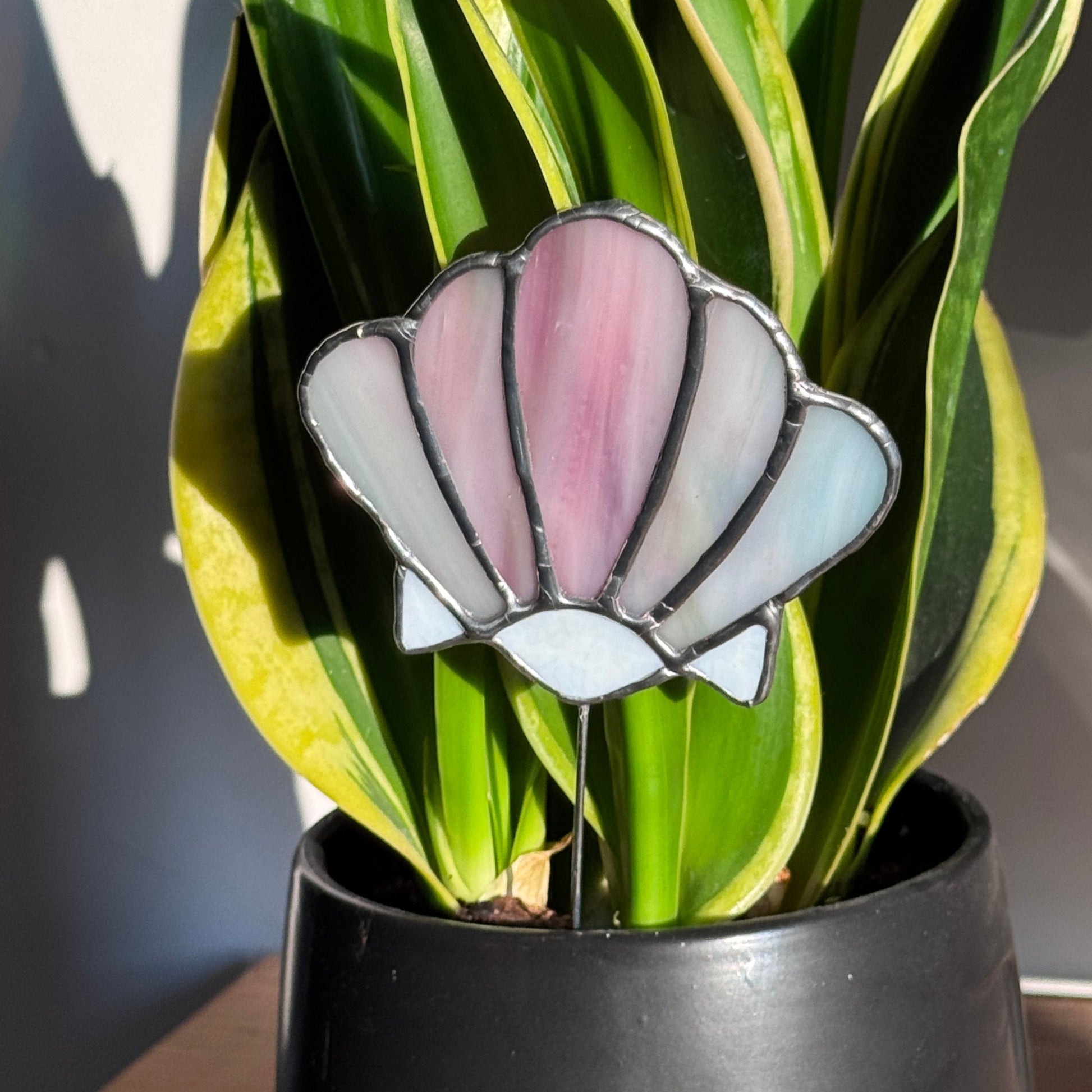 Sublimez vos plantes avec ce piquet décoratif en vitrail, représentant un coquillage en verre rose, et nuances de bleu et vert.
