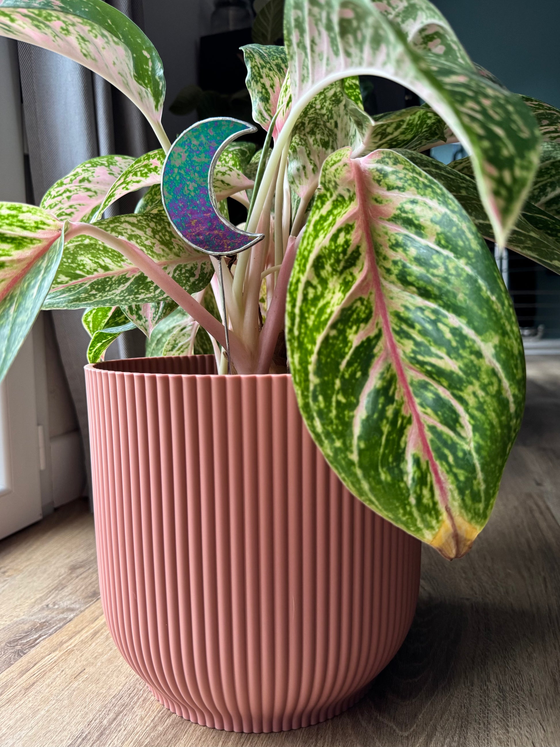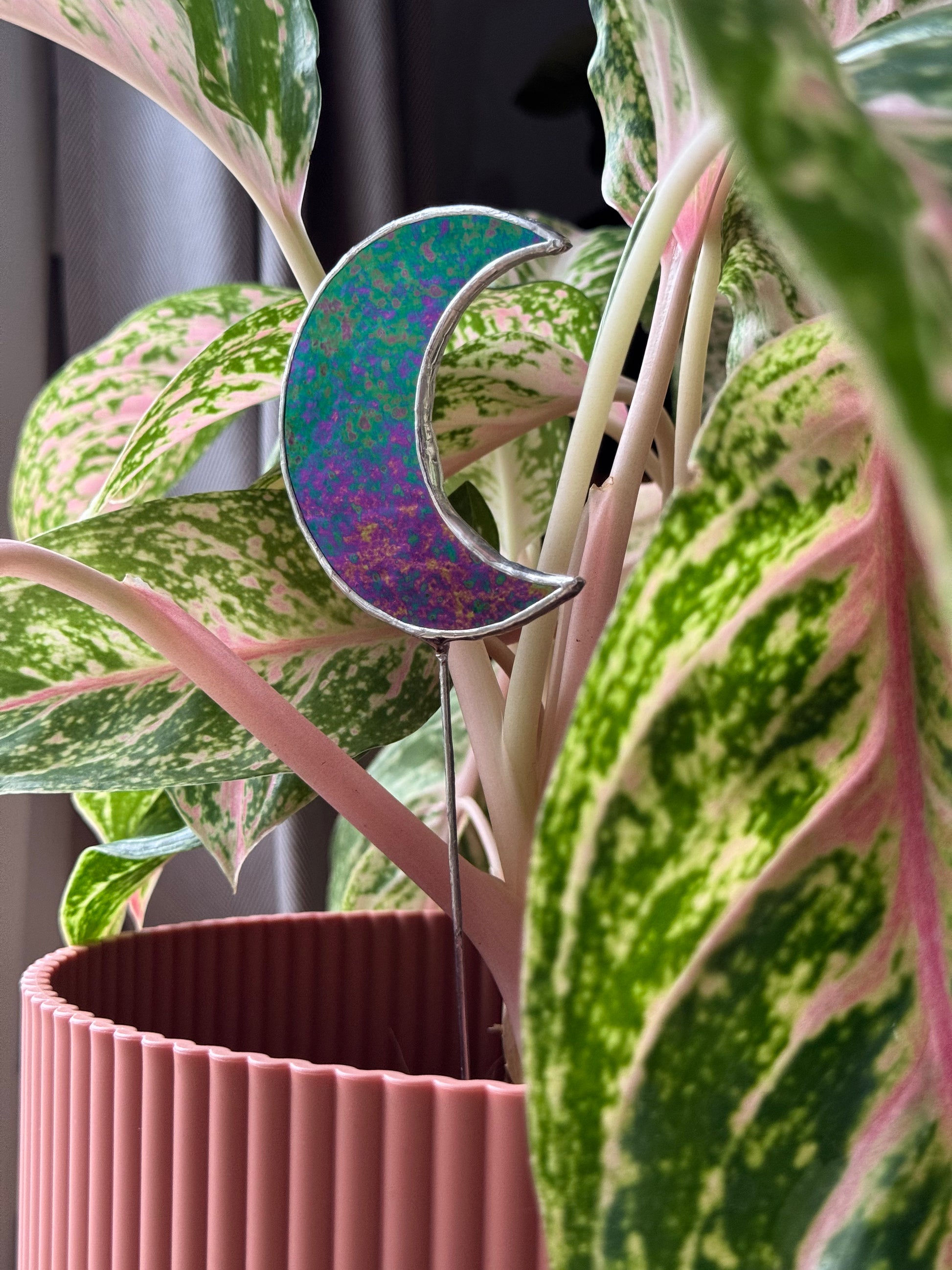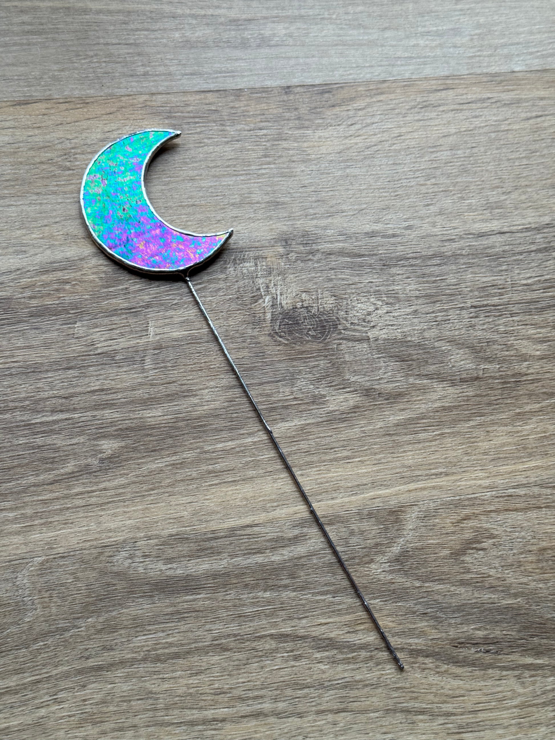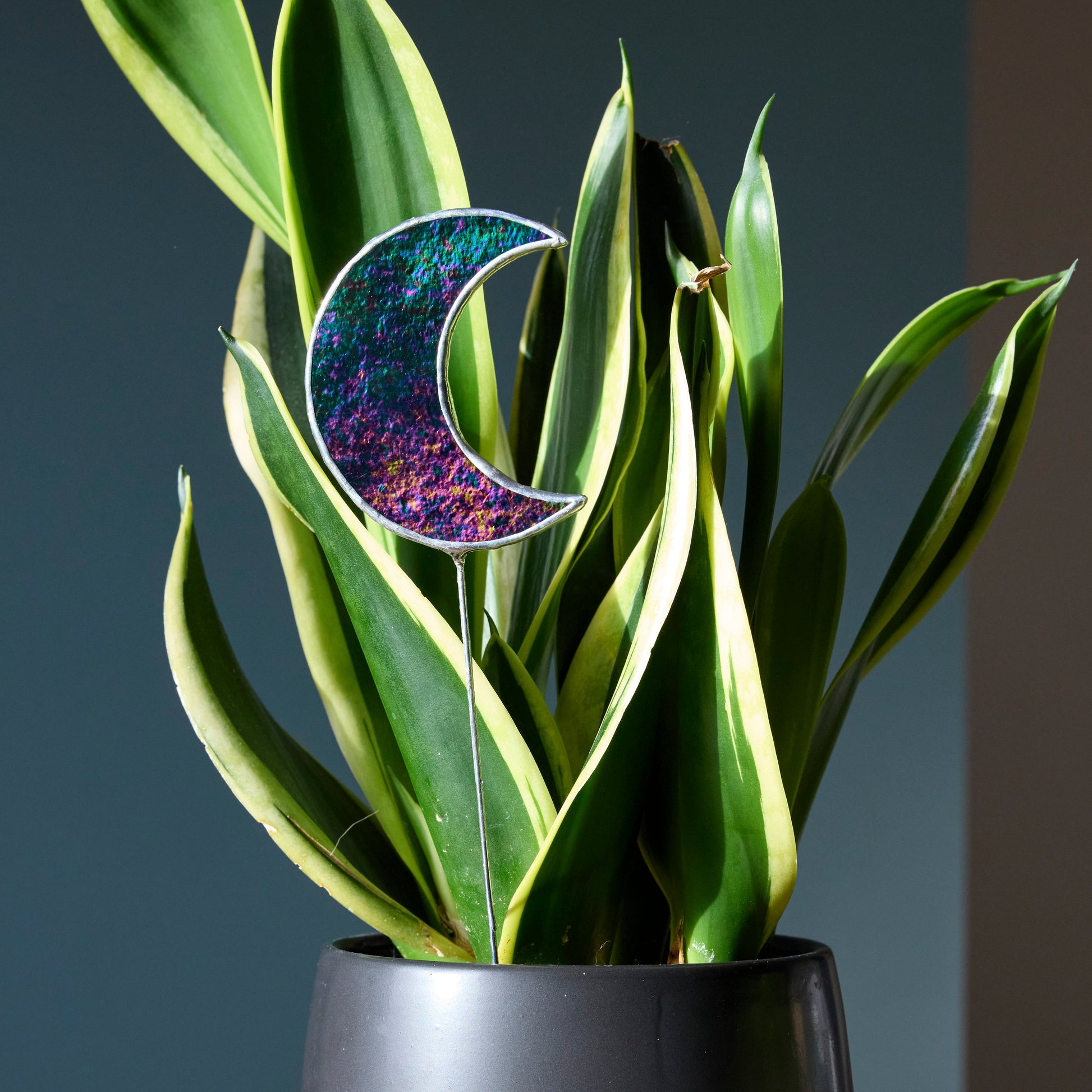 Mettez en valeur vos plantes avec ce piquet décoratif en vitrail, représentant une lune, en verre noir iridescent.