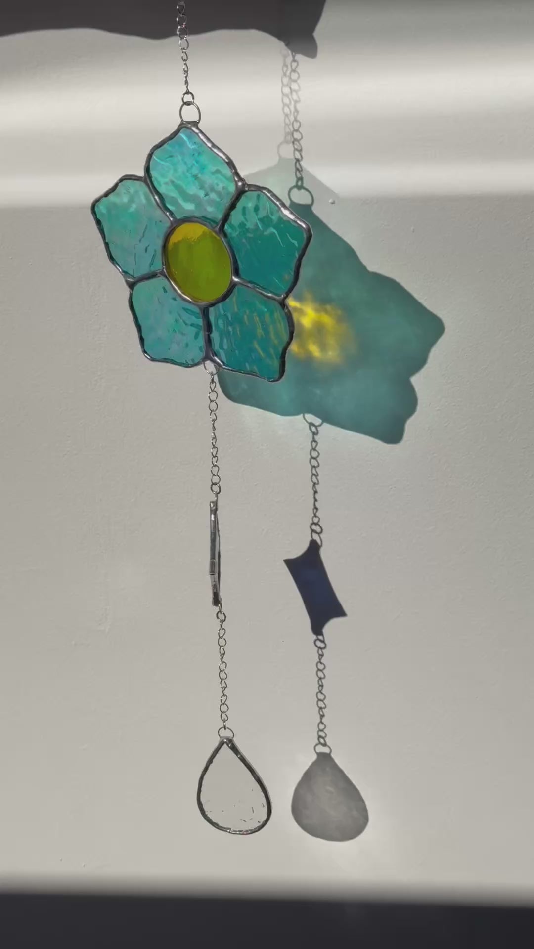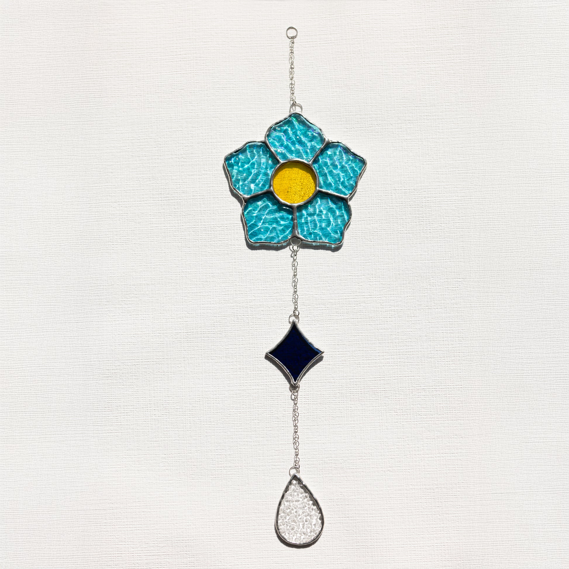 Cette suspension en verre, entièrement façonnée à la main dans mon atelier en Bretagne, mêle savoir-faire artisanal et esthétique délicate. Fleur en verre bleu irisé, étoile bleu profond et goutte cristalline : chaque élément est découpé avec soin selon la technique du vitrail Tiffany.