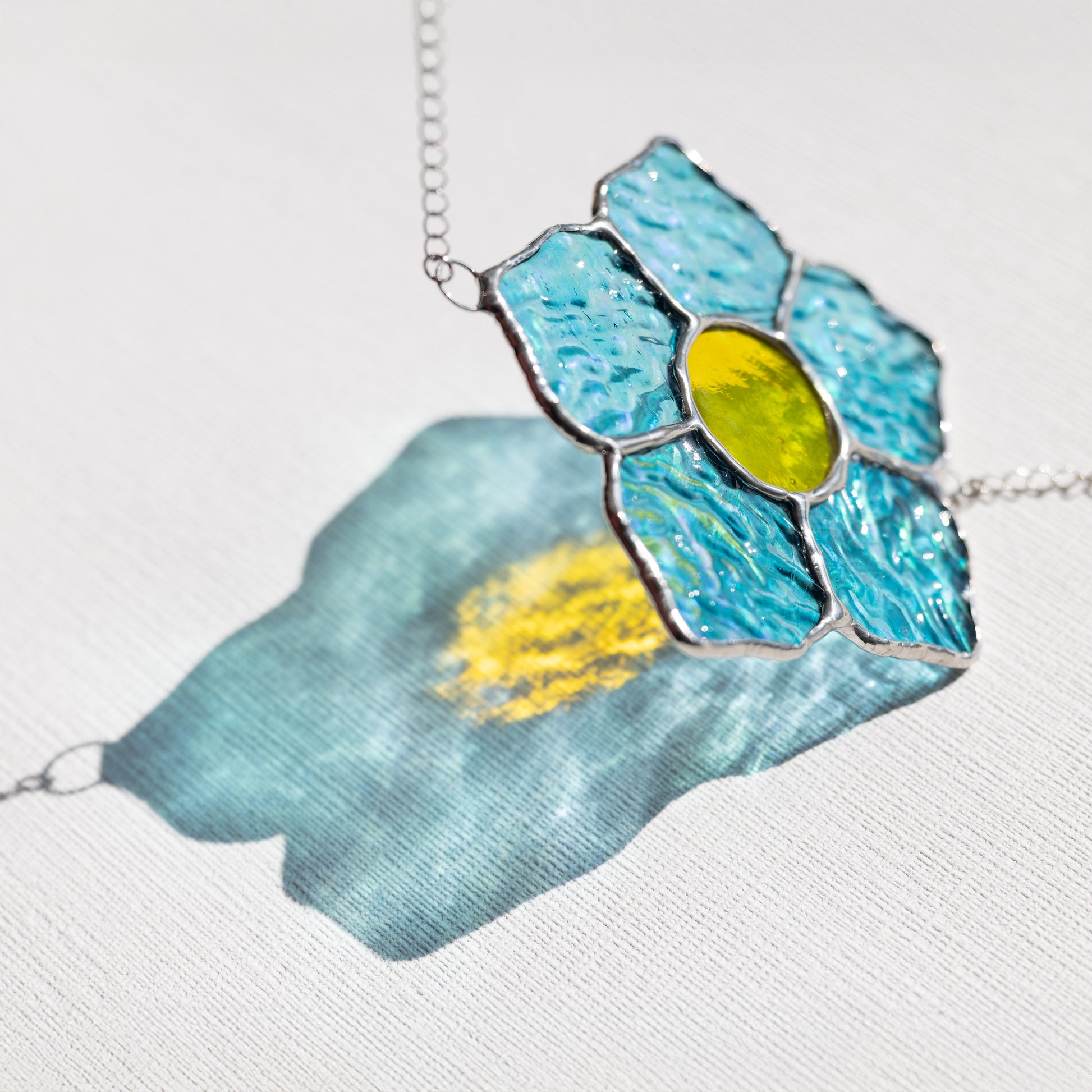 - Forme : Une fleur bleue au centre jaune, mise en valeur grâce à un verre bleu façonné en forme de losange et un verre en goutte cristalline