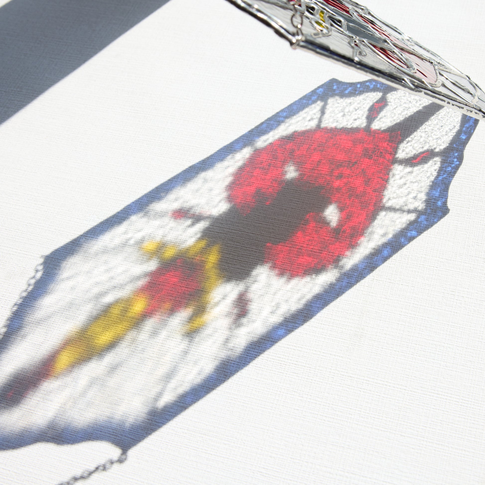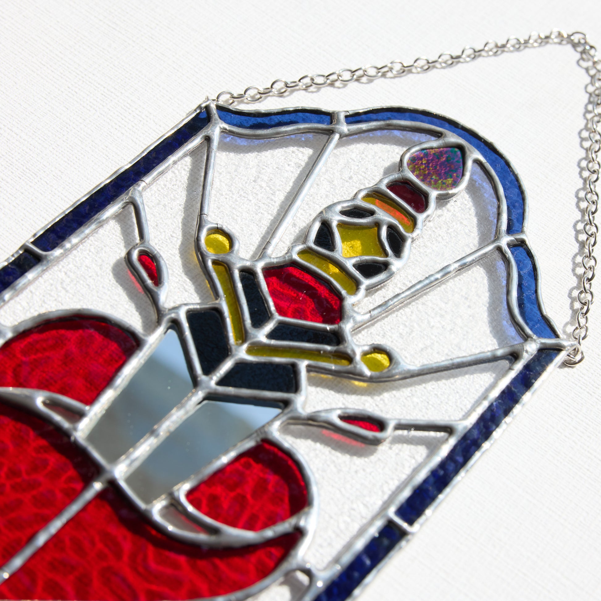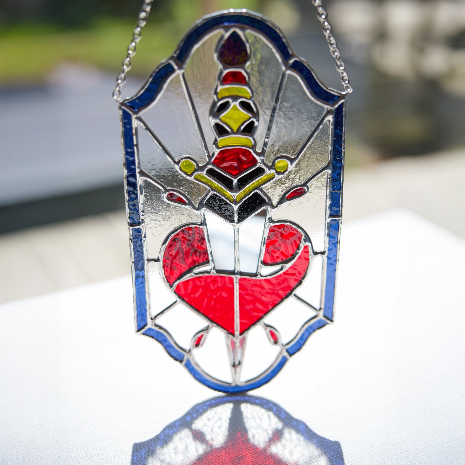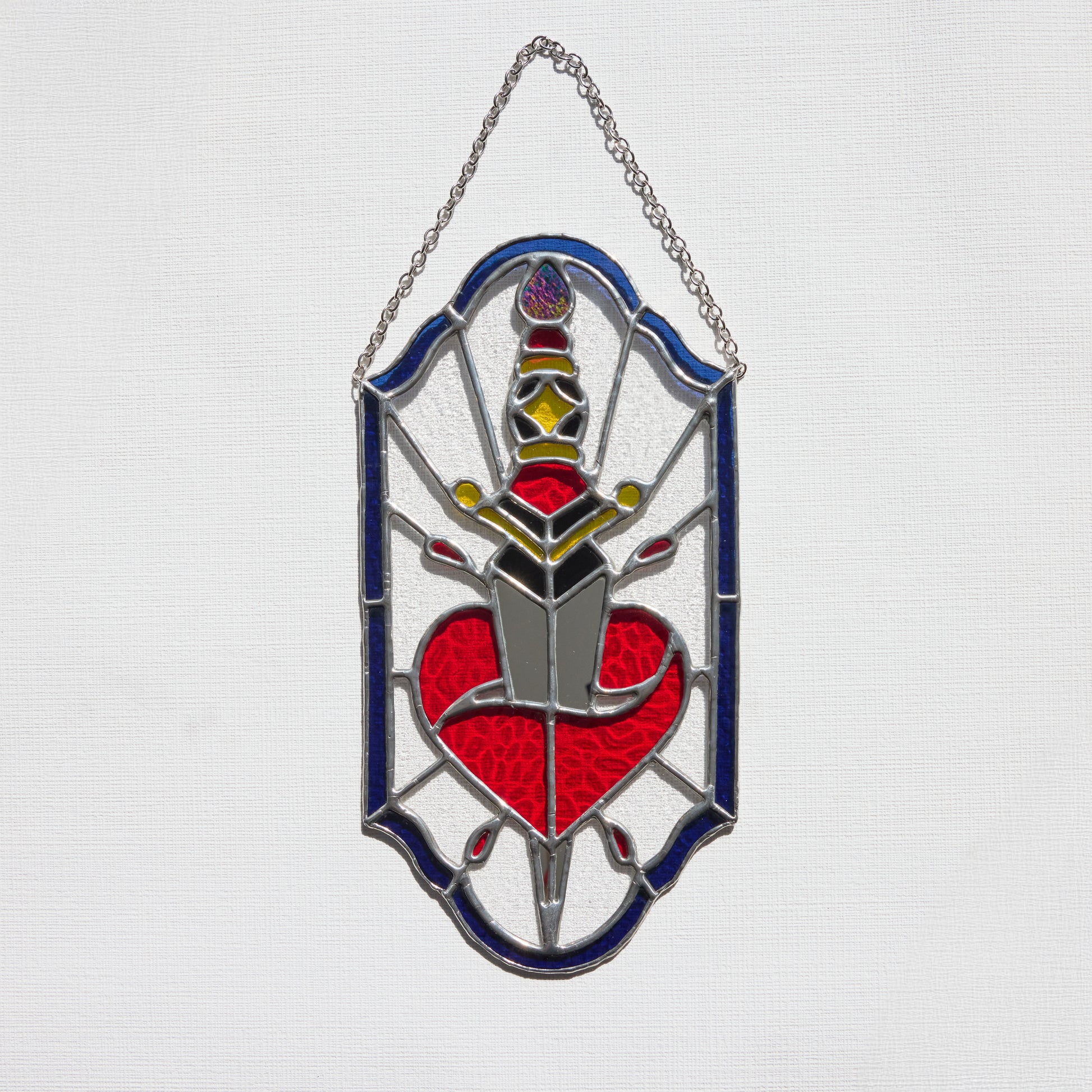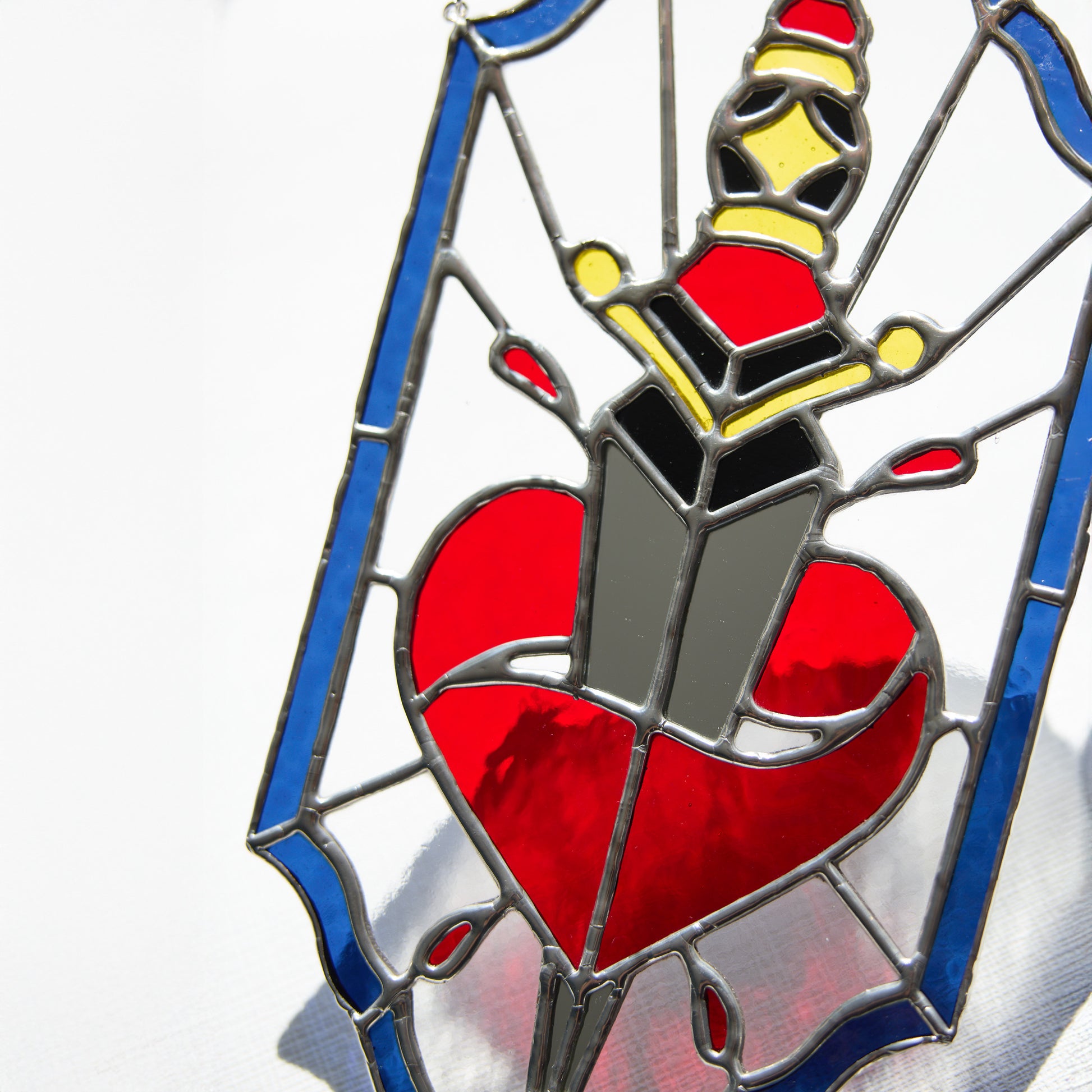 Ce vitrail unique s'inspire de l'esthétique des tatouages old school : une dague transperçant un cœur rouge, symbole fort de passion, de douleur ou de courage. La lame en verre miroir capte la lumière et crée des reflets saisissants, tandis que le cœur vif contraste avec un encadrement bleu intense.