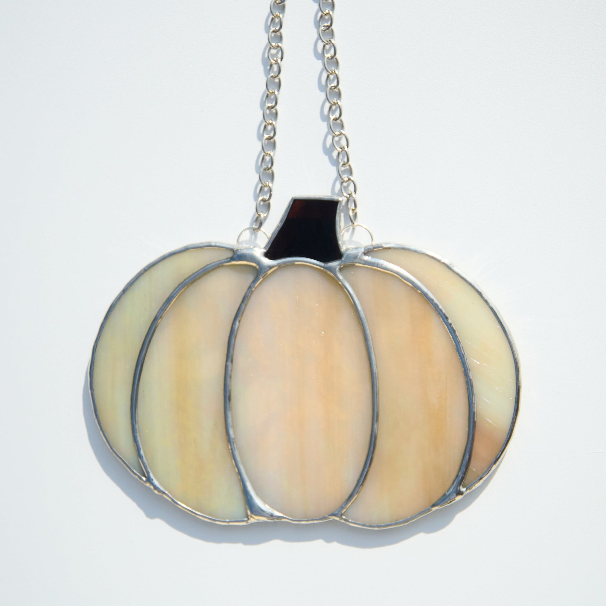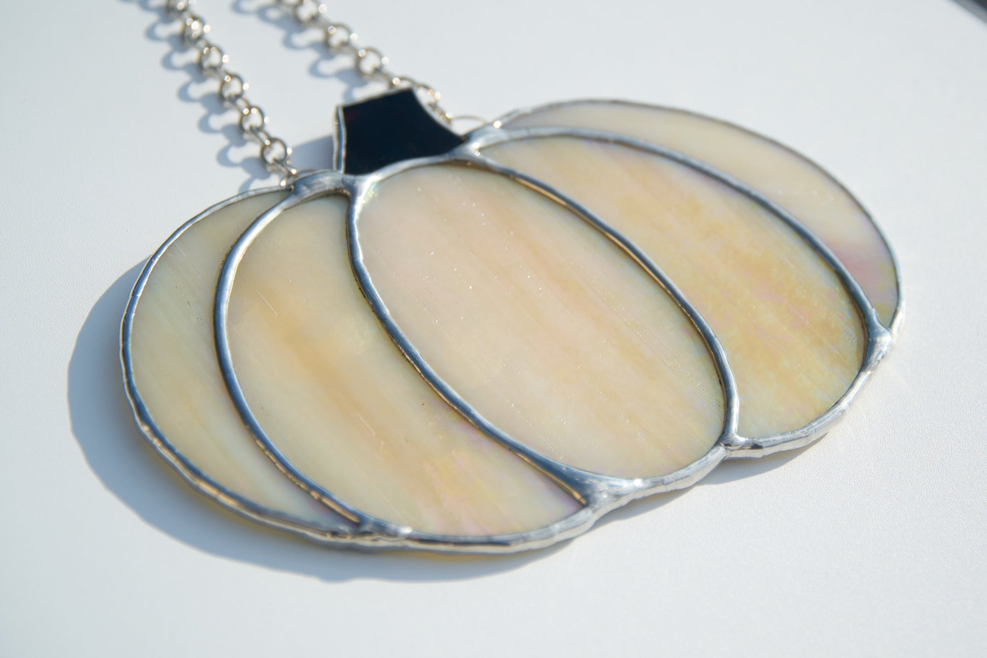 Illuminez votre intérieur avec ce vitrail suspendu en forme de citrouille, réalisé en verre opalescent jaune aux reflets irisés.
