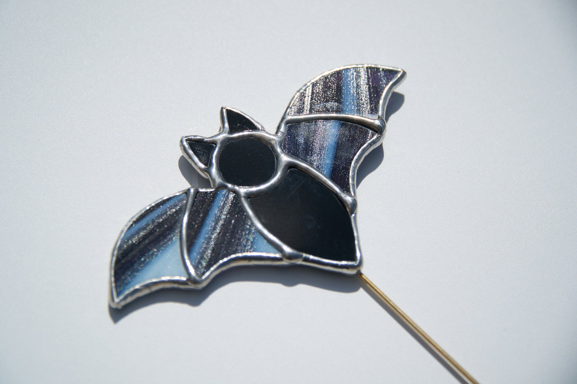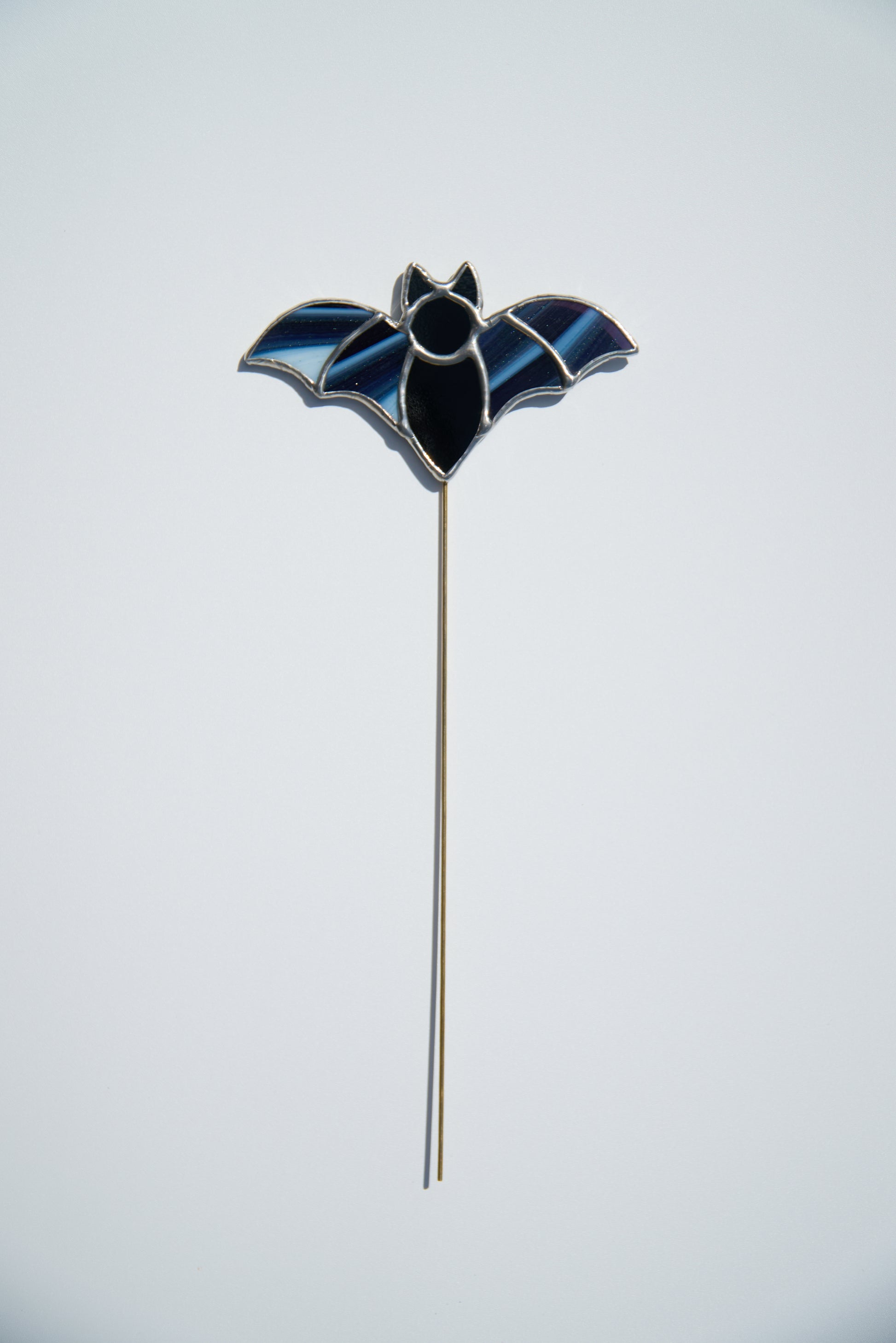 Mettez en valeur vos plantes avec ce piquet décoratif en vitrail, représentant une chauve-souris aux nuances violettes scintillantes.