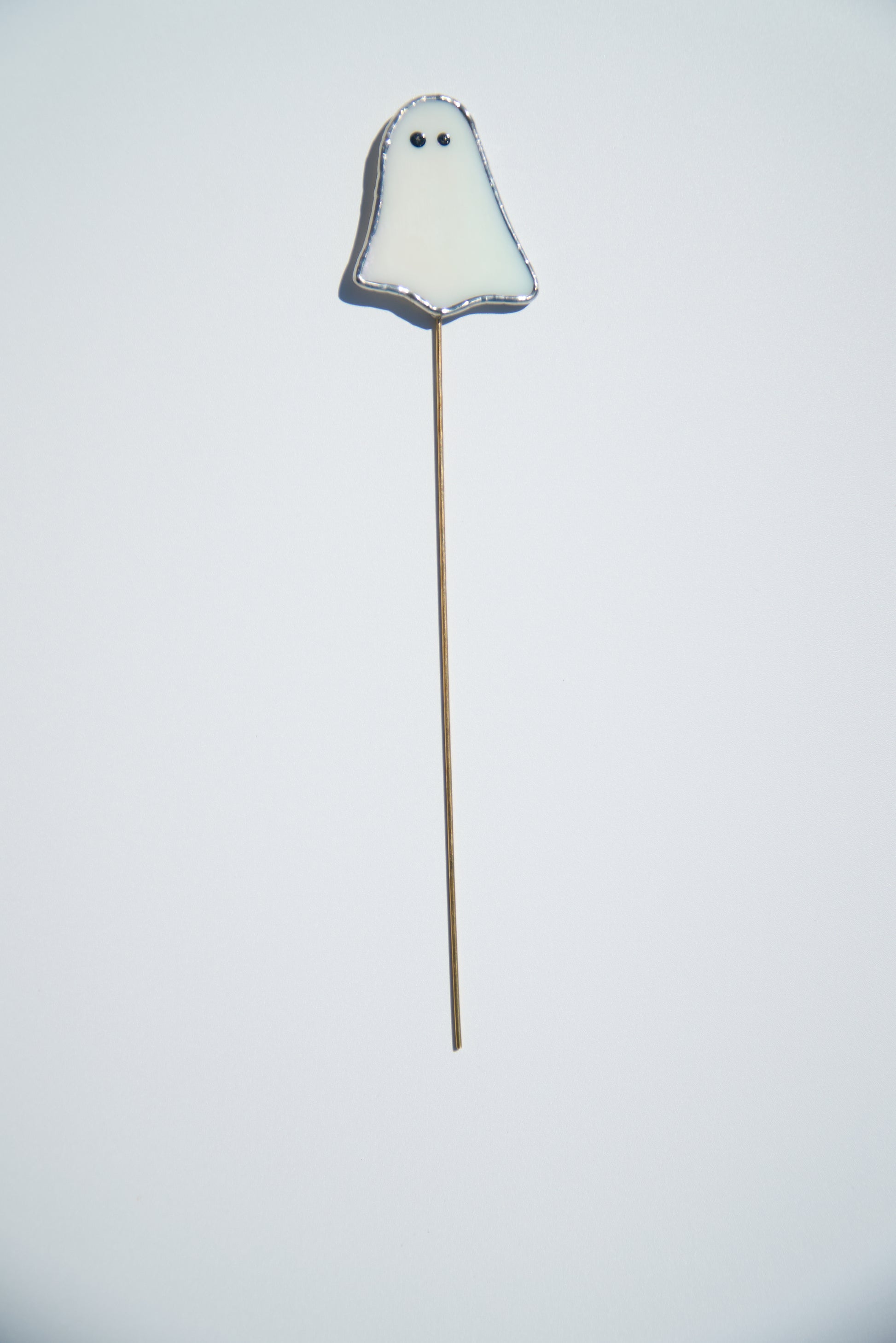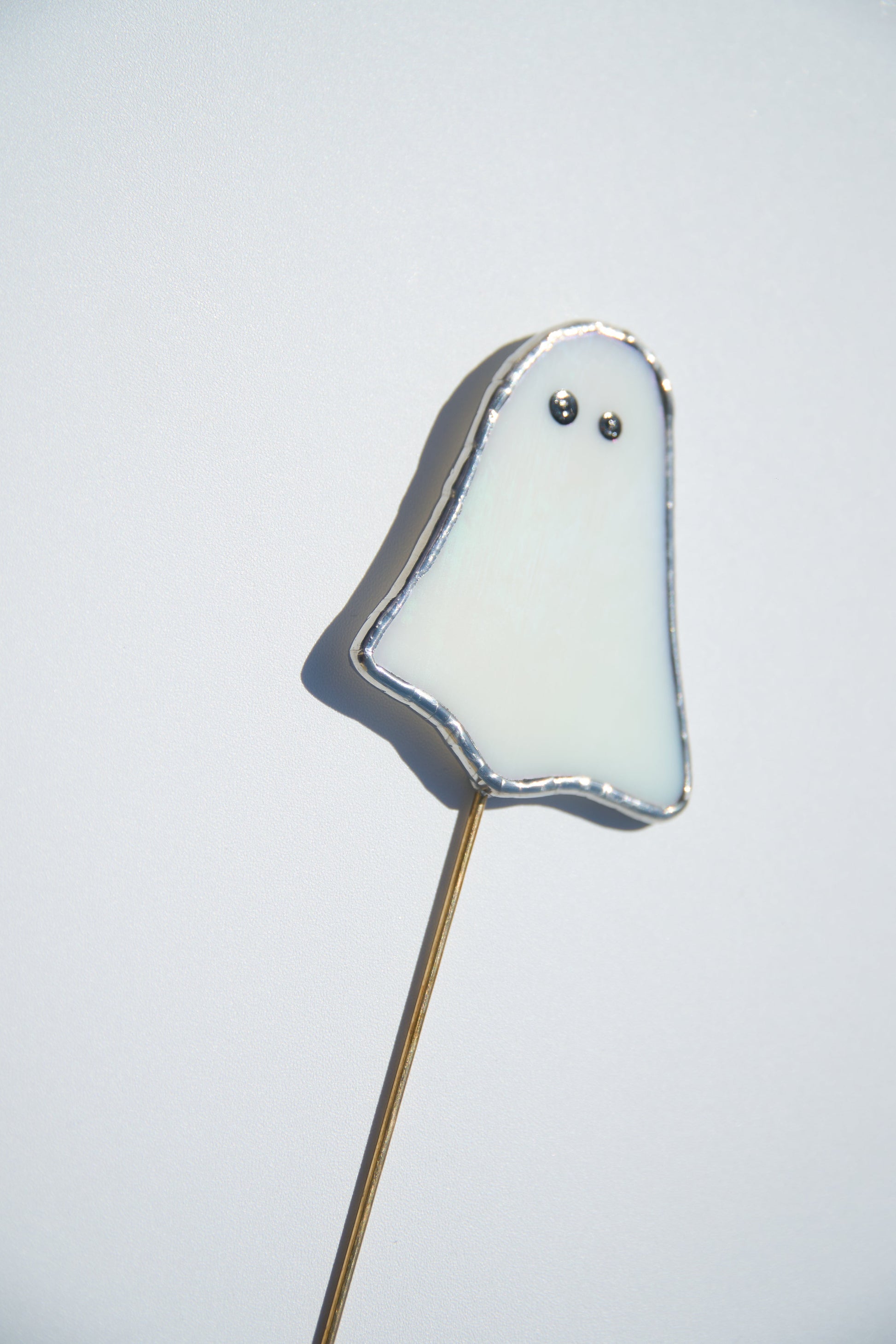 Mettez en valeur vos plantes avec ce piquet décoratif en vitrail, représentant un petit fantôme en verre blanc irisé.