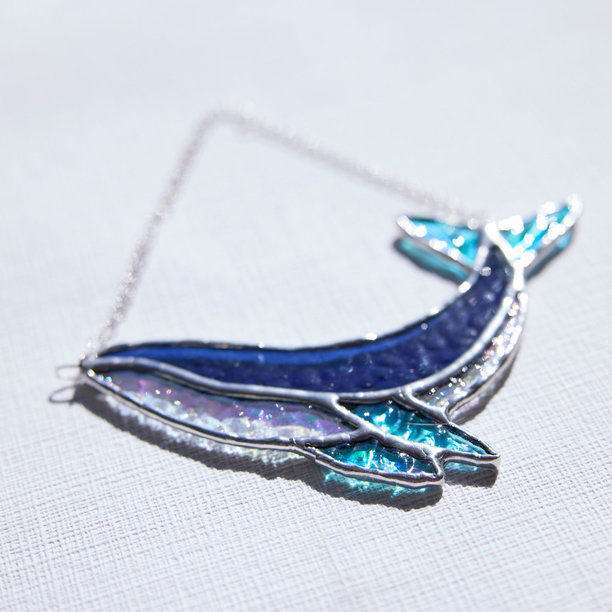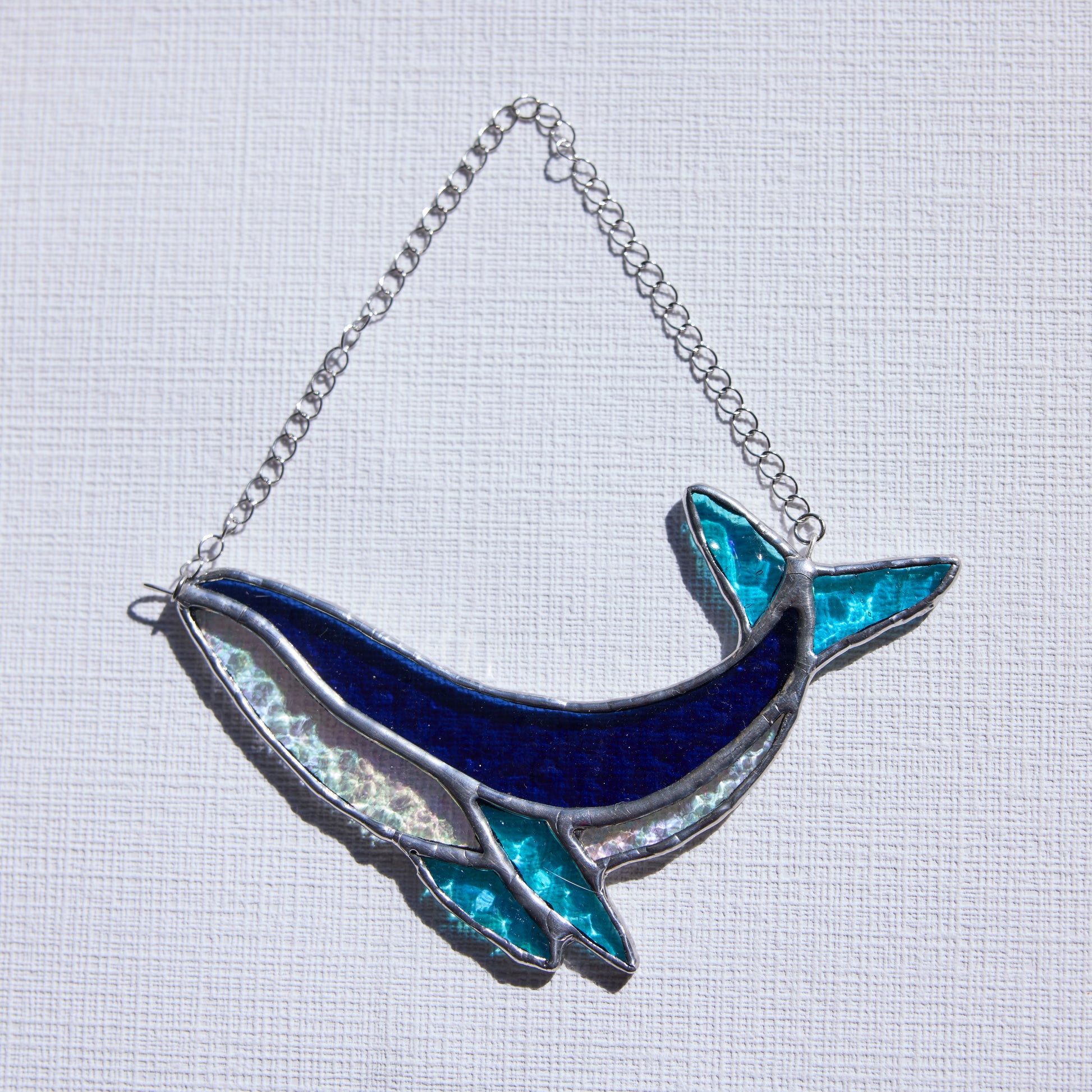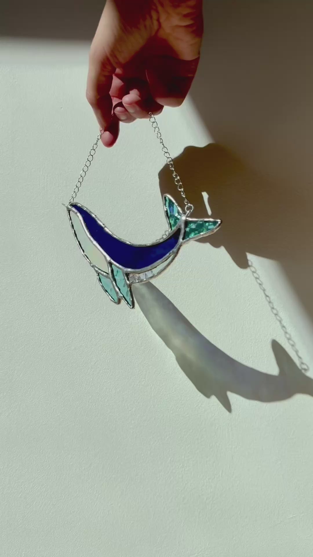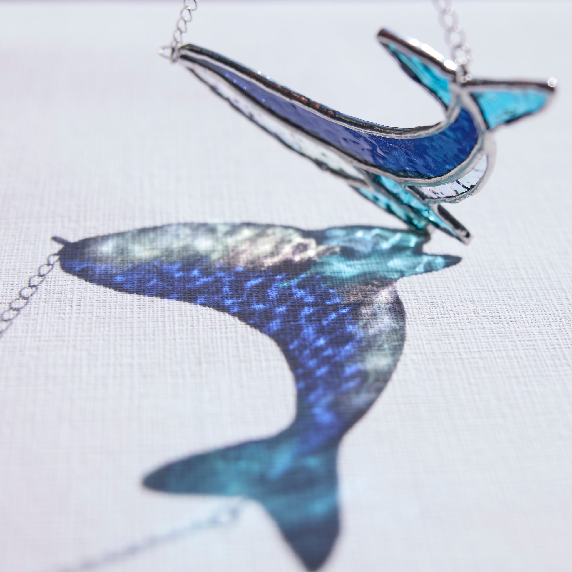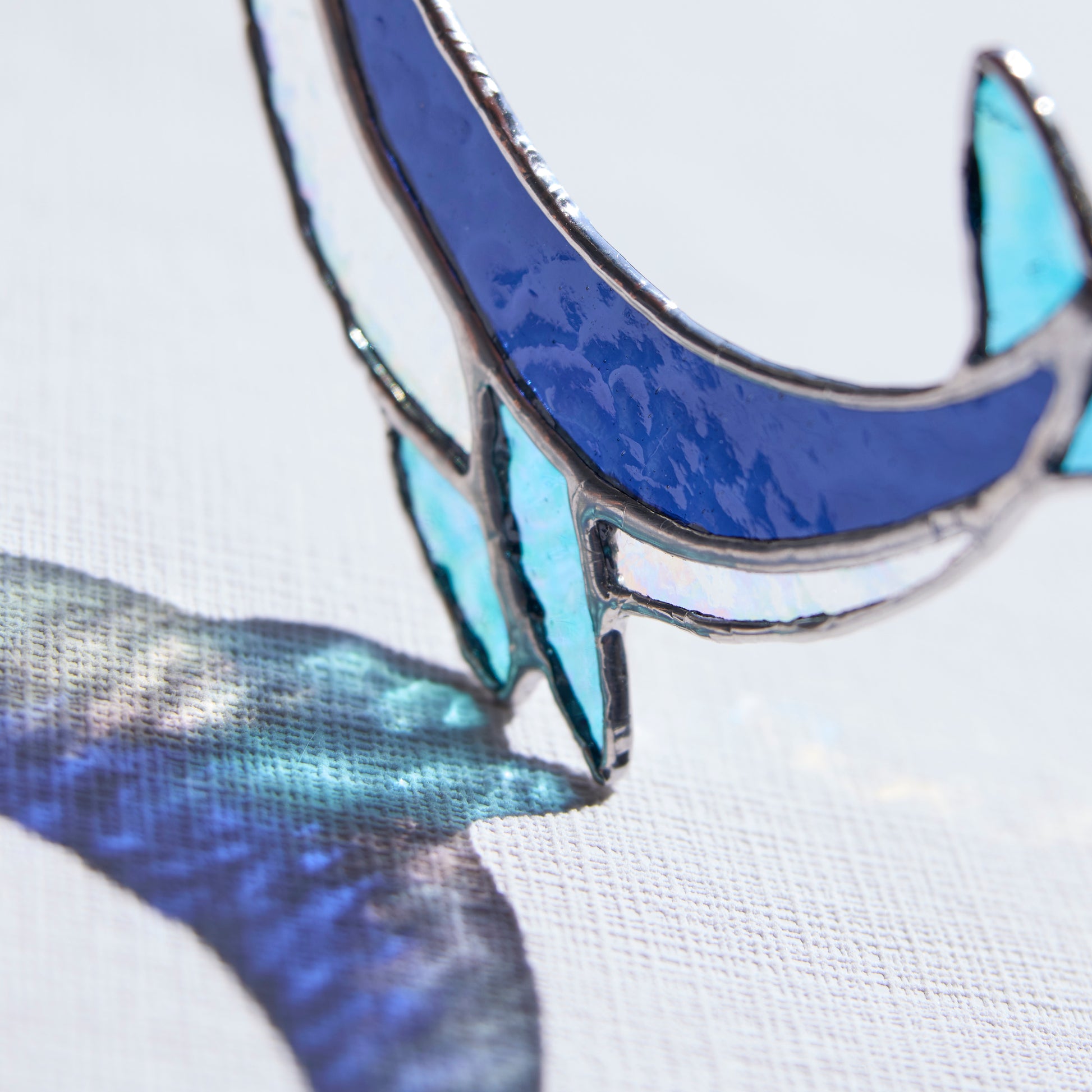 Apportez une touche marine et poétique à votre intérieur avec ce vitrail représentant une baleine, réalisé à la main selon la technique Tiffany dans mon atelier en Bretagne.