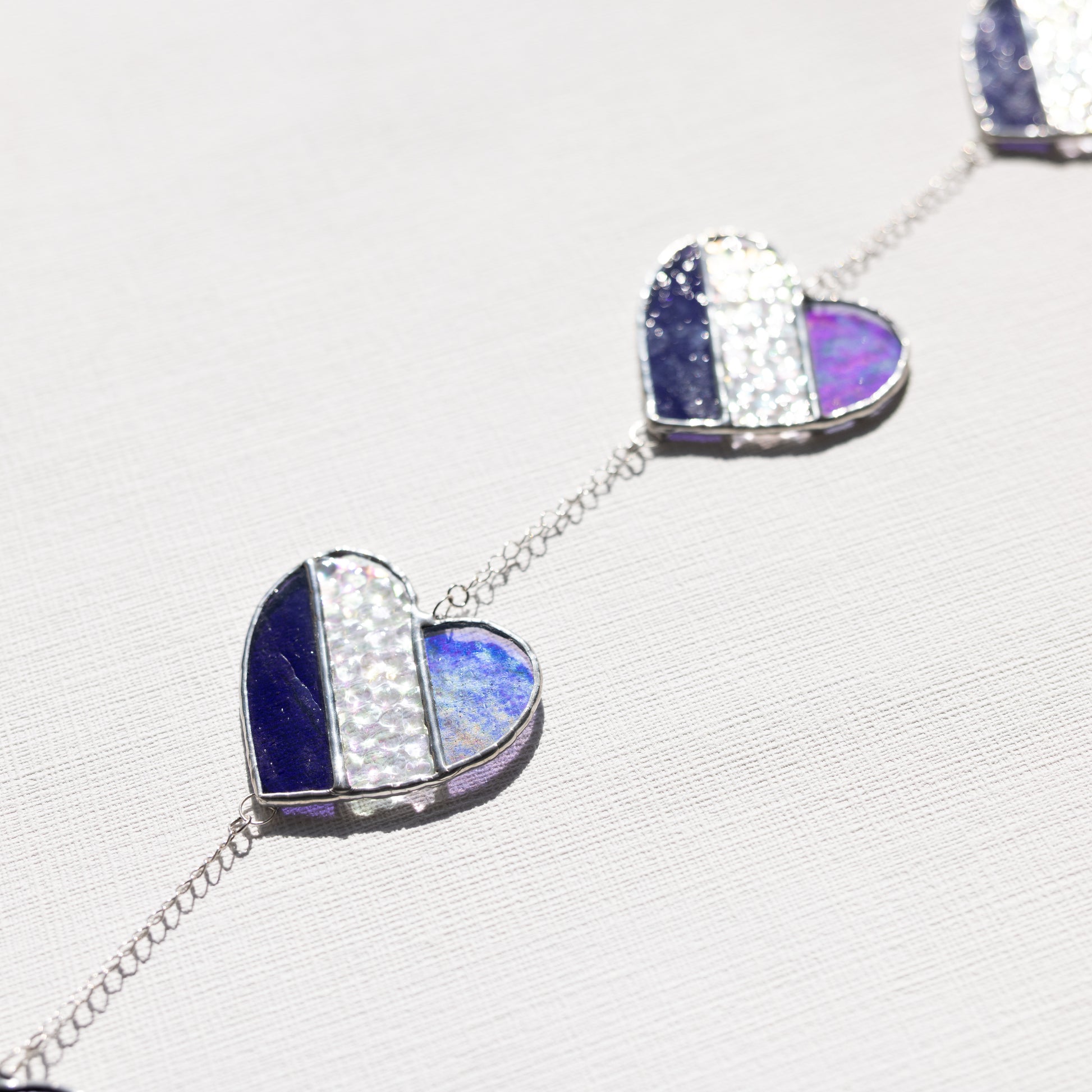Suspension vitrail cœurs en verre artisanal, réalisée à la main en Bretagne avec la technique Tiffany. Les 5 cœurs captent la lumière pour créer de reflets doux et magiques.