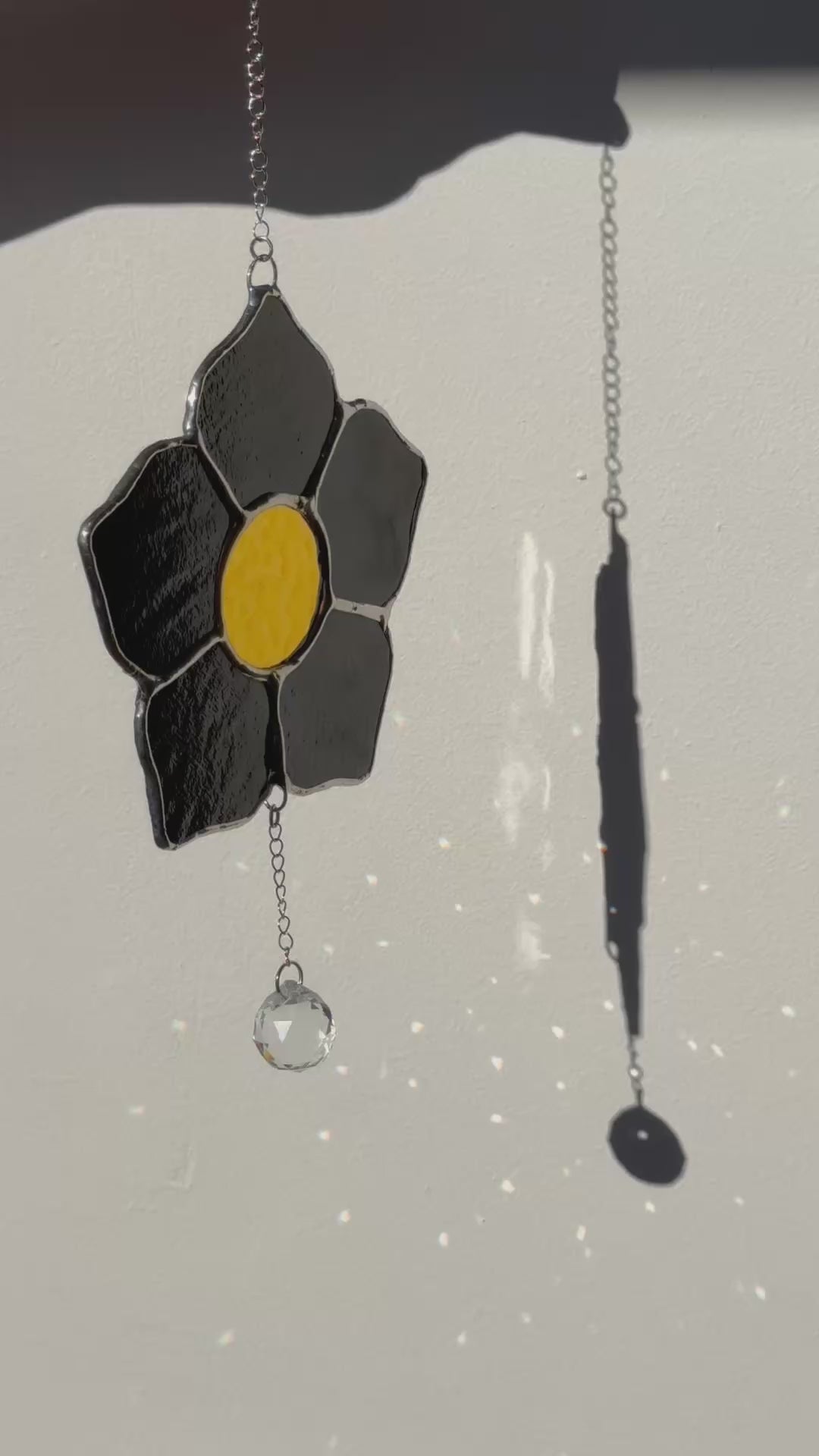 Ajoutez une touche de poésie moderne à votre intérieur avec ce vitrail en forme de fleur, entièrement réalisé à la main en Bretagne selon la technique Tiffany.