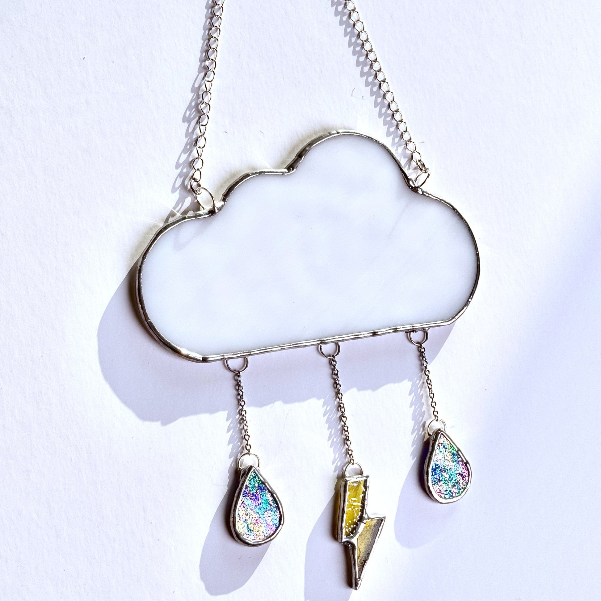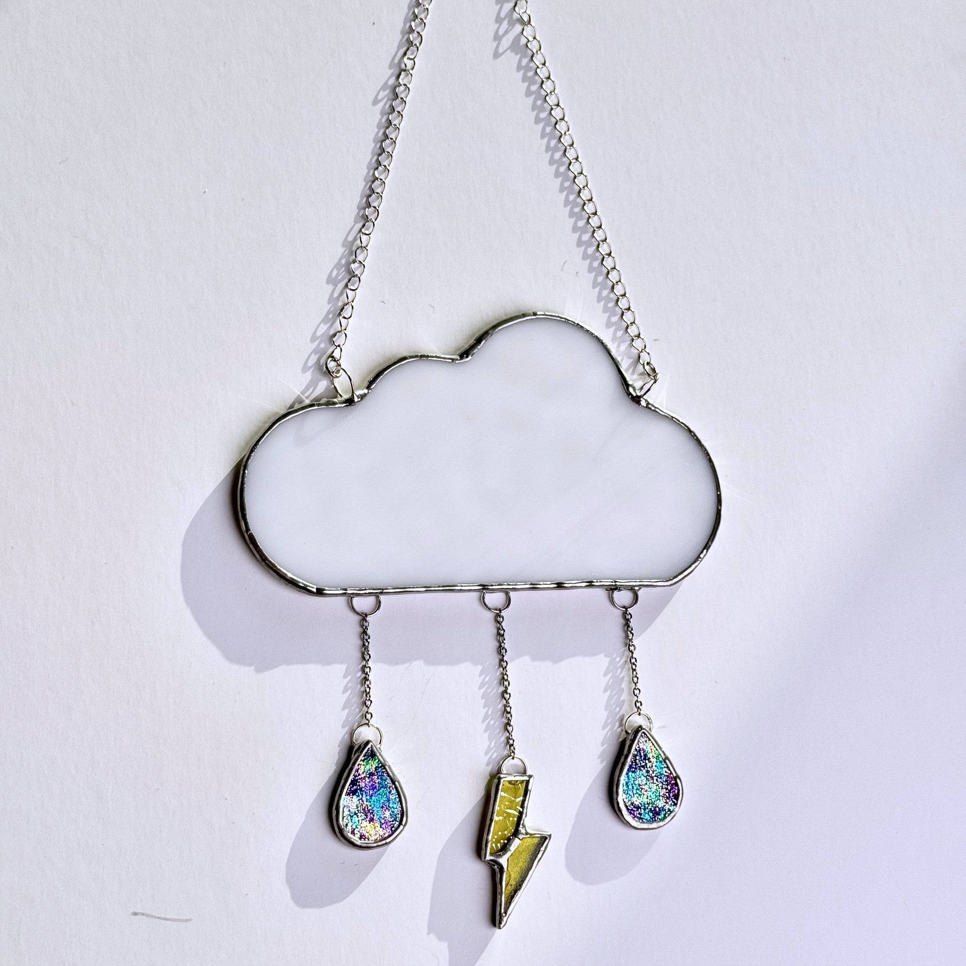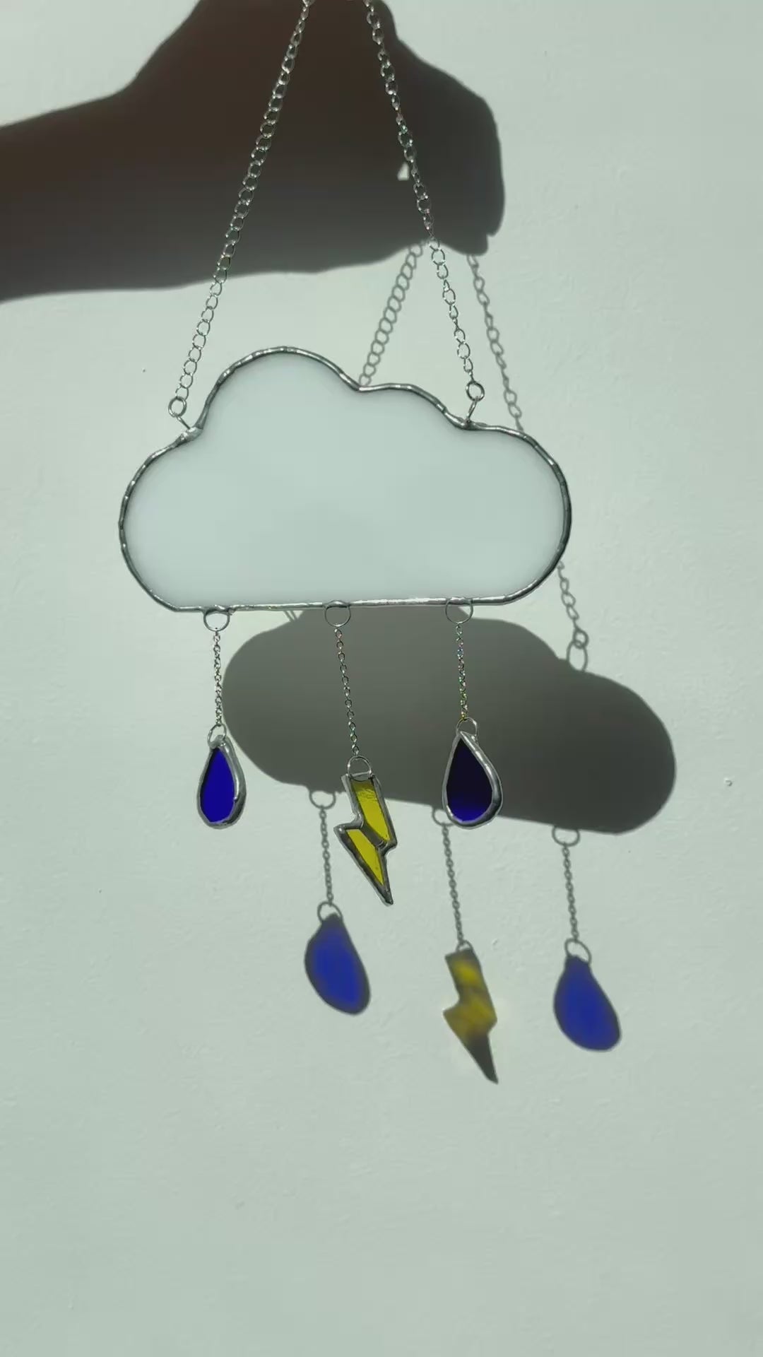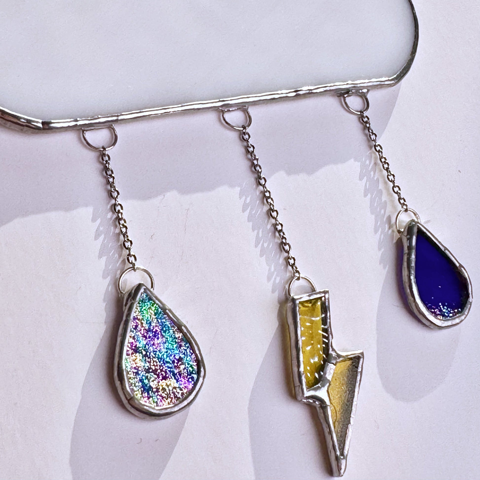 Ce vitrail moderne et poétique représente un nuage en verre blanc, auquel sont suspendus par trois chaînes argentées, deux gouttes d’eau en verre bleu irisé et un éclair en verre jaune vif.