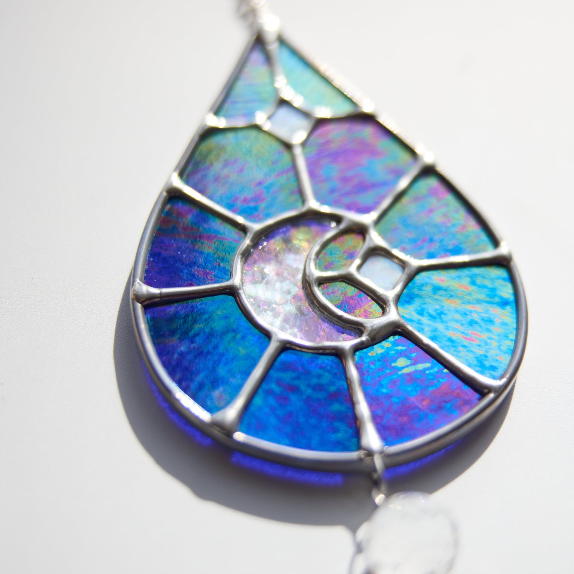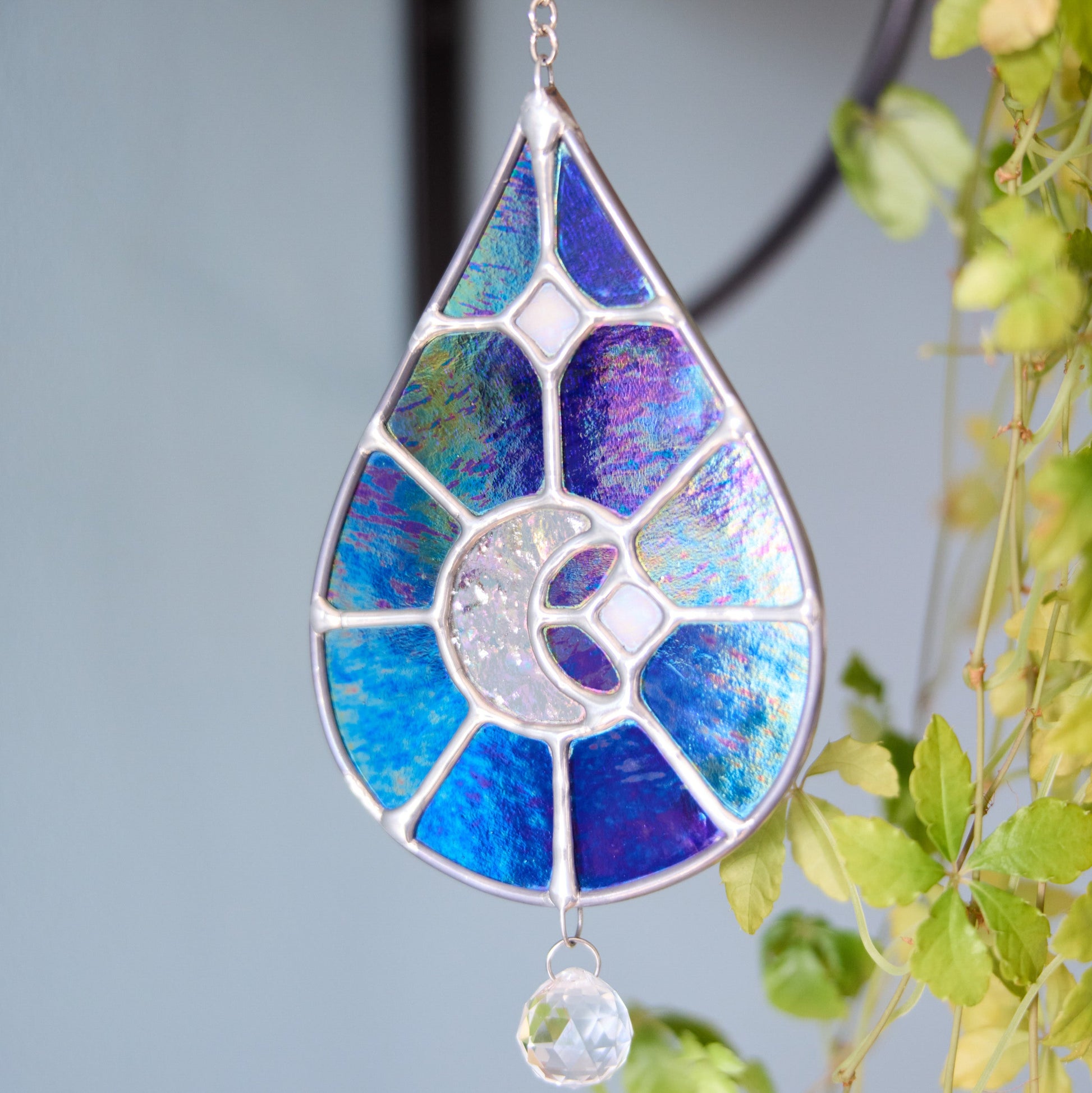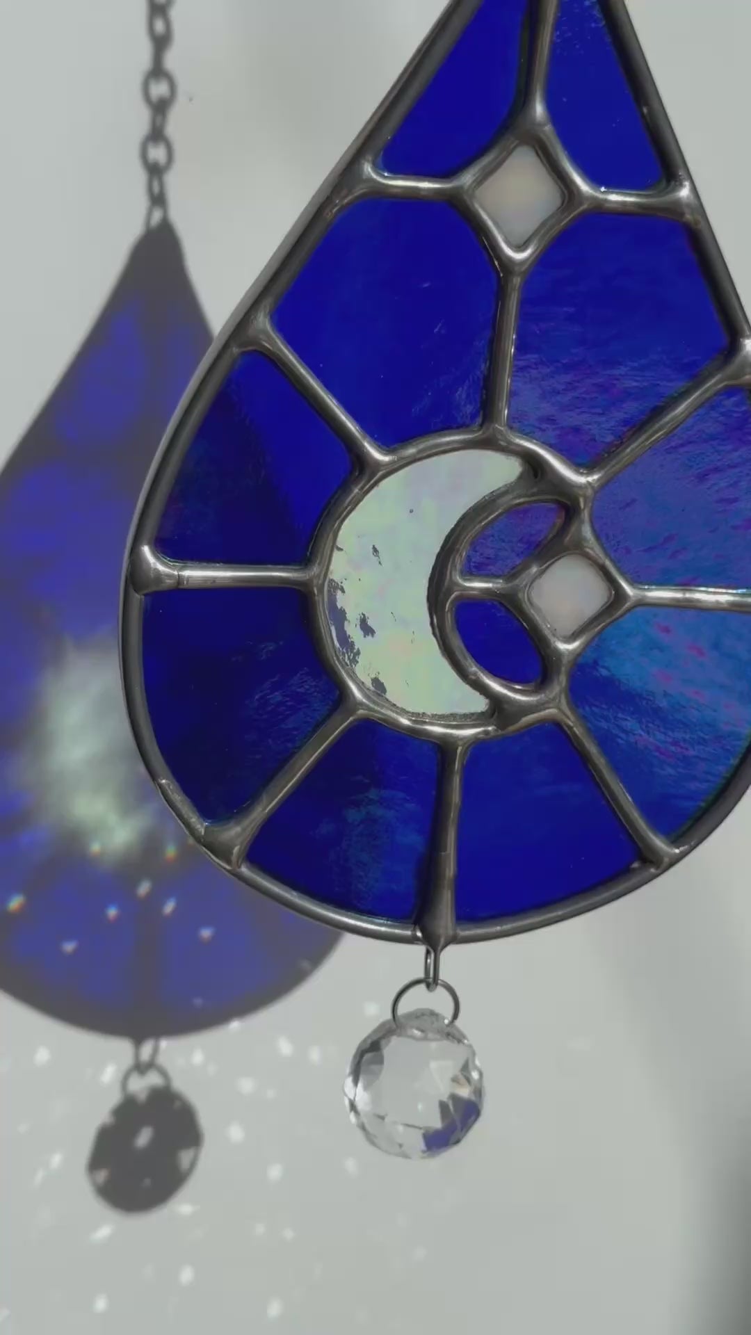 Son verre bleu aux multiples reflets donne une profondeur envoûtante à la lune et aux deux étoiles qui le composent. Sous le vitrail, un cristal suspendu capte la lumière et la diffuse en éclats scintillants.