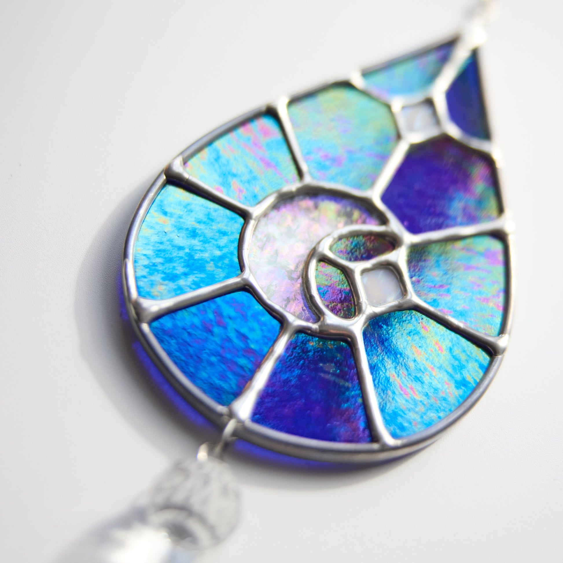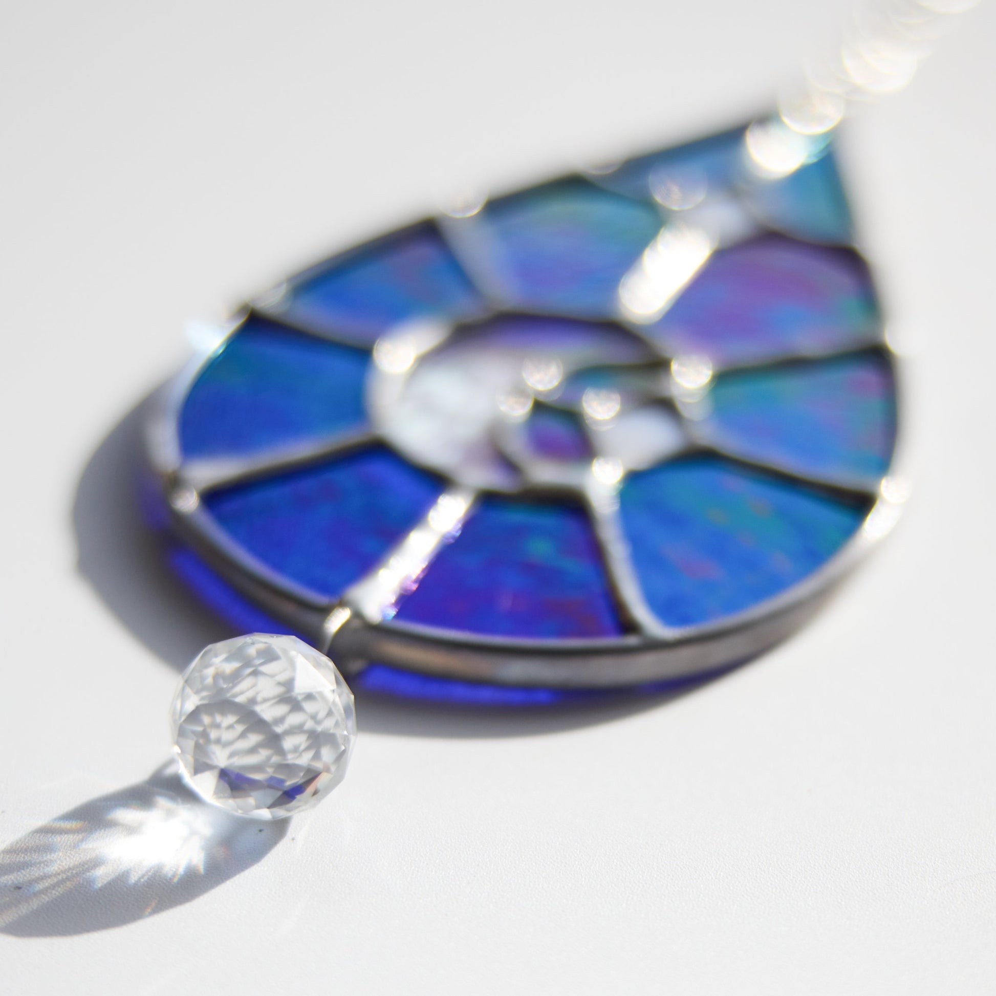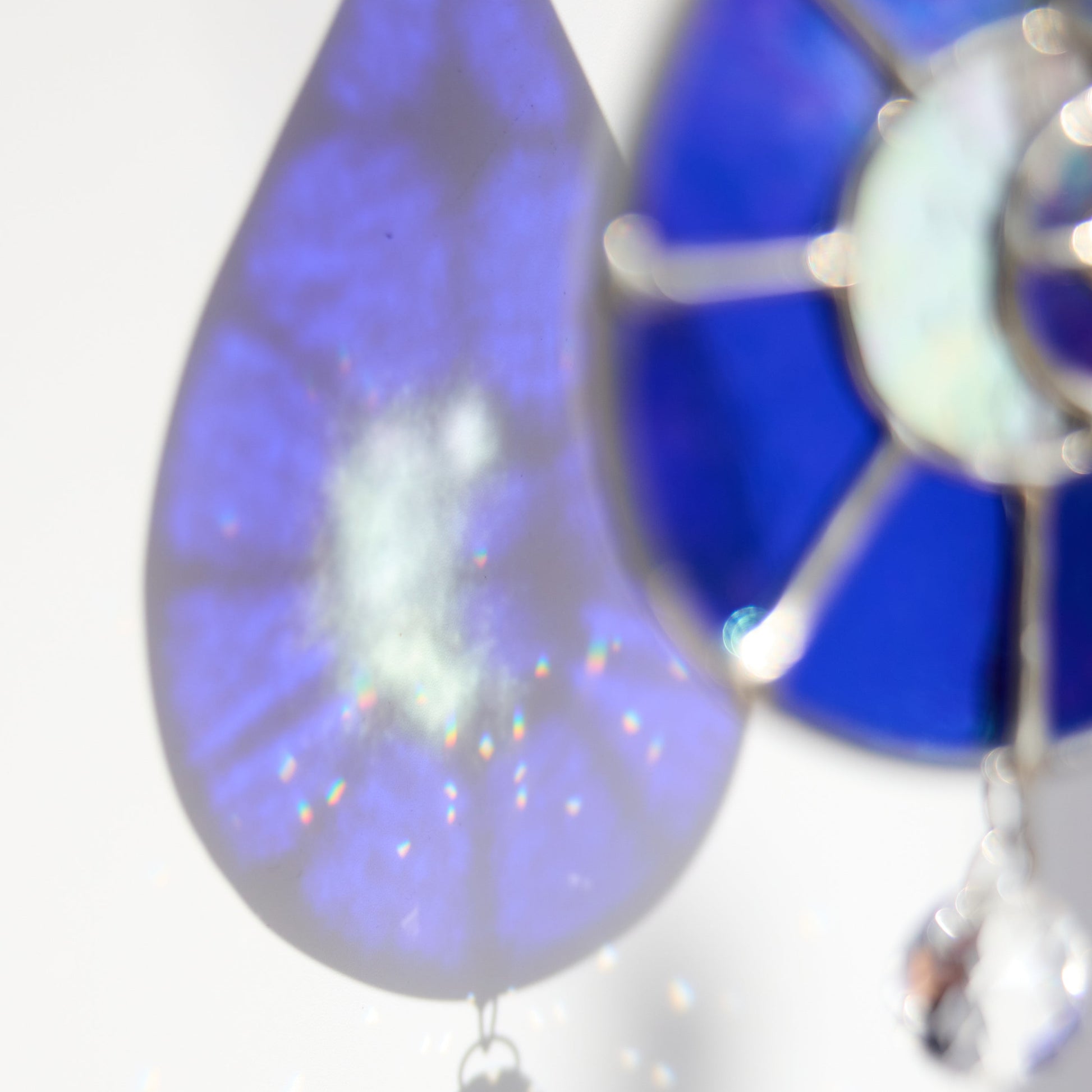 Son verre bleu aux multiples reflets donne une profondeur envoûtante à la lune et aux deux étoiles qui le composent. Sous le vitrail, un cristal suspendu capte la lumière et la diffuse en éclats scintillants.