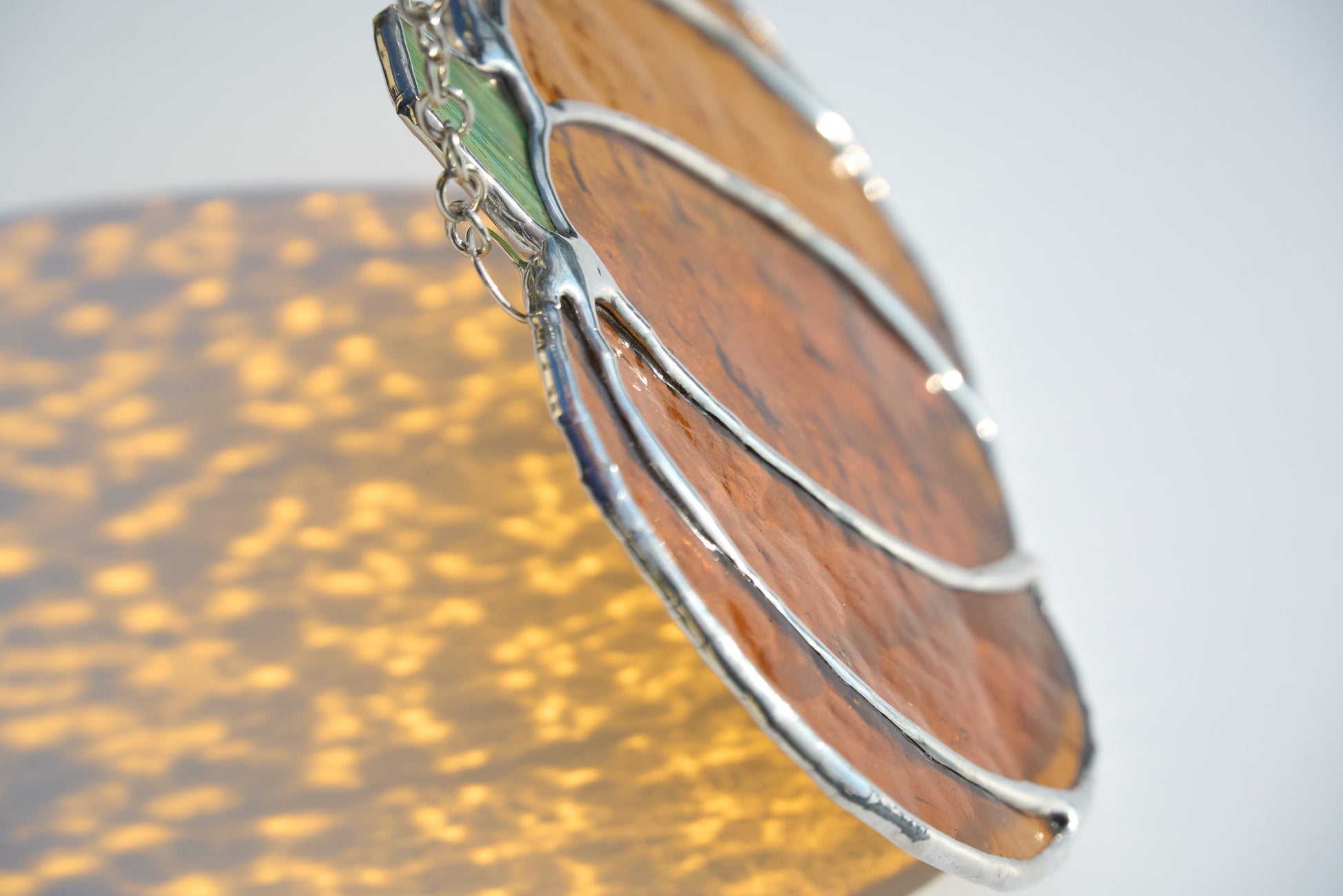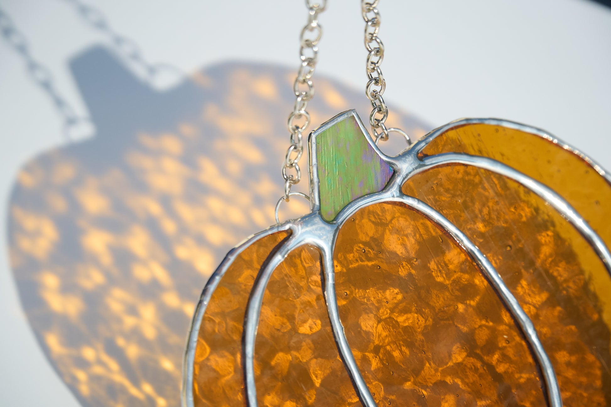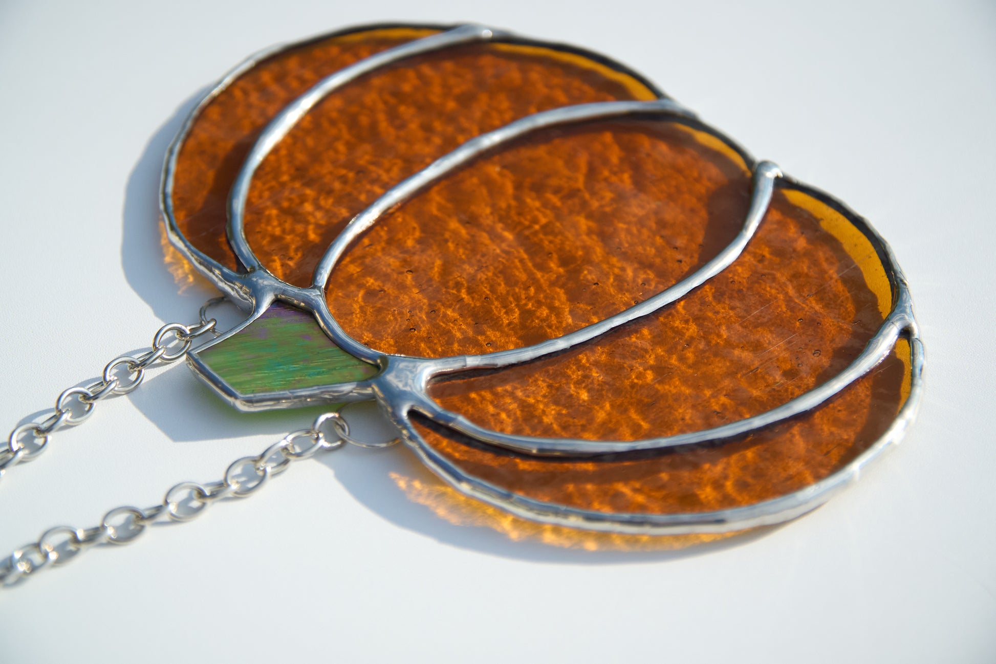 Sublimez votre décoration avec ce vitrail suspendu en forme de citrouille, réalisée en verre orange éclatant.