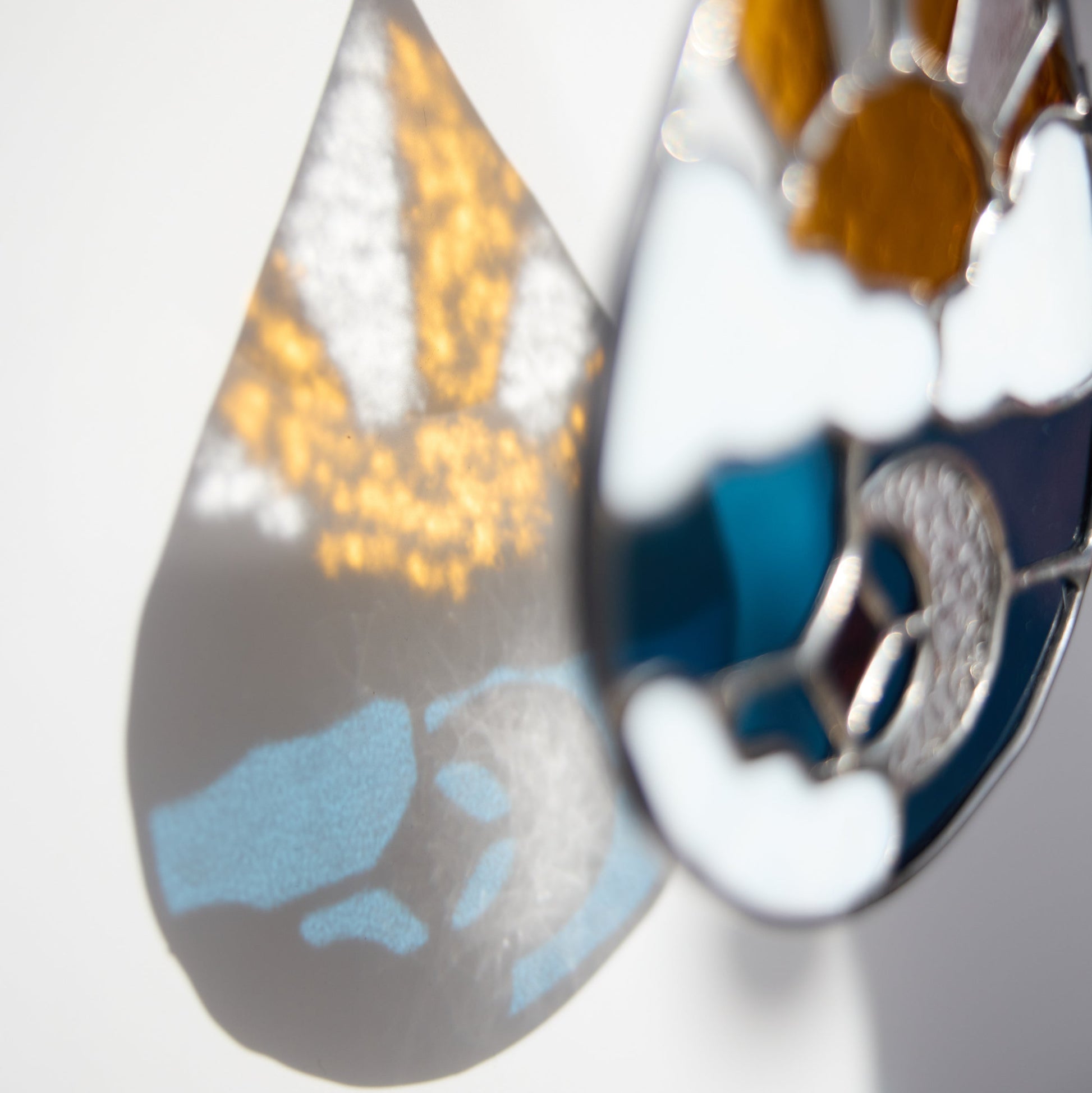 - Forme : Goutte avec en partie haute un lever de soleil, et en partie basse un ciel étoilé