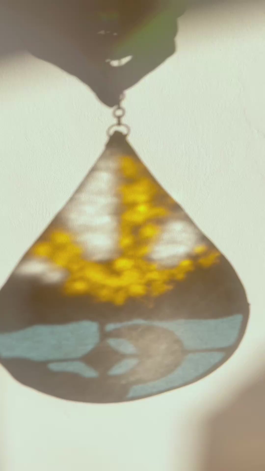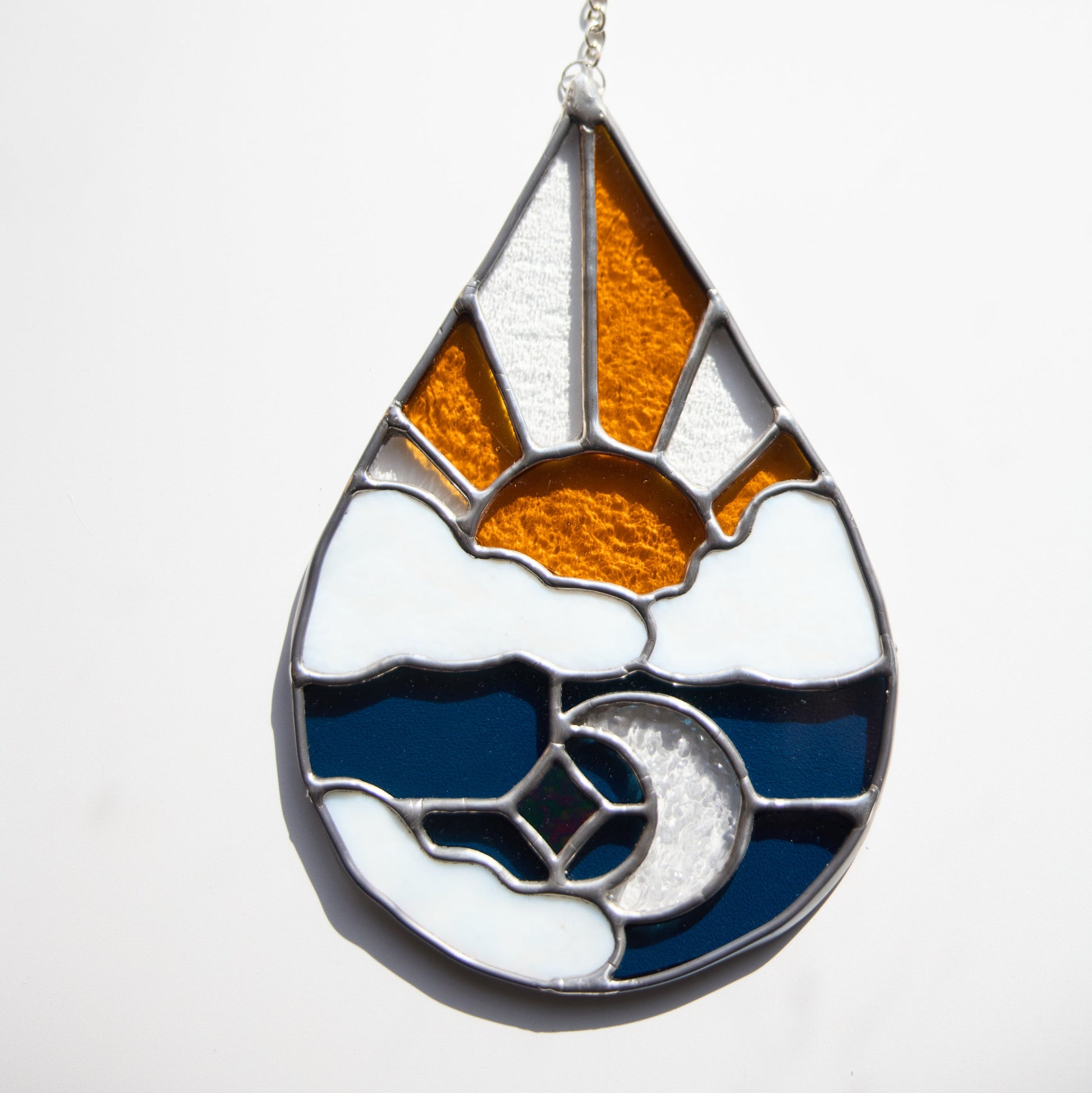 Apportez une touche céleste à votre intérieur avec “Entre Jour et Nuit”- L’harmonie du Soleil et de la Lune, un vitrail artisanal capturant la rencontre du soleil doré et de la lune bleu nuit, entourés d’une étoile scintillante et de nuages délicats.