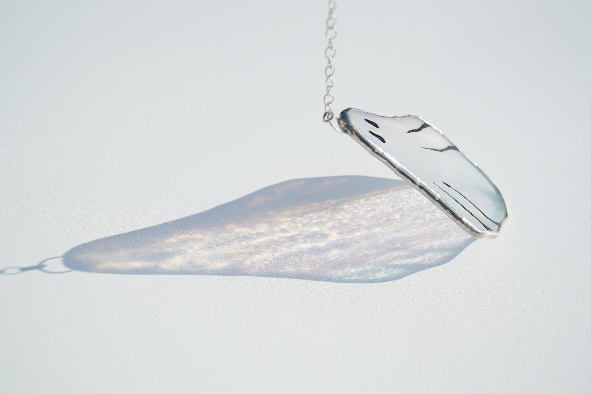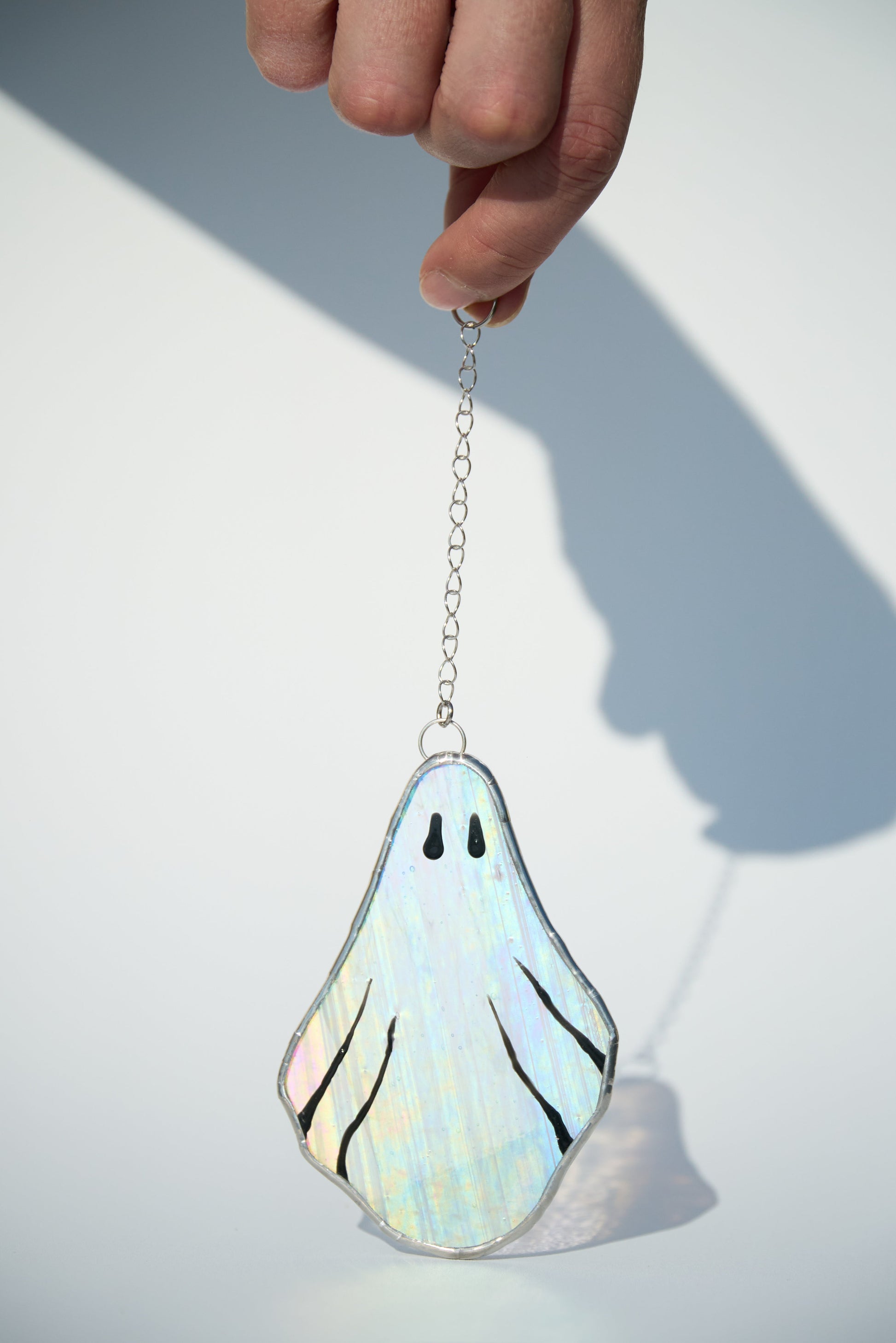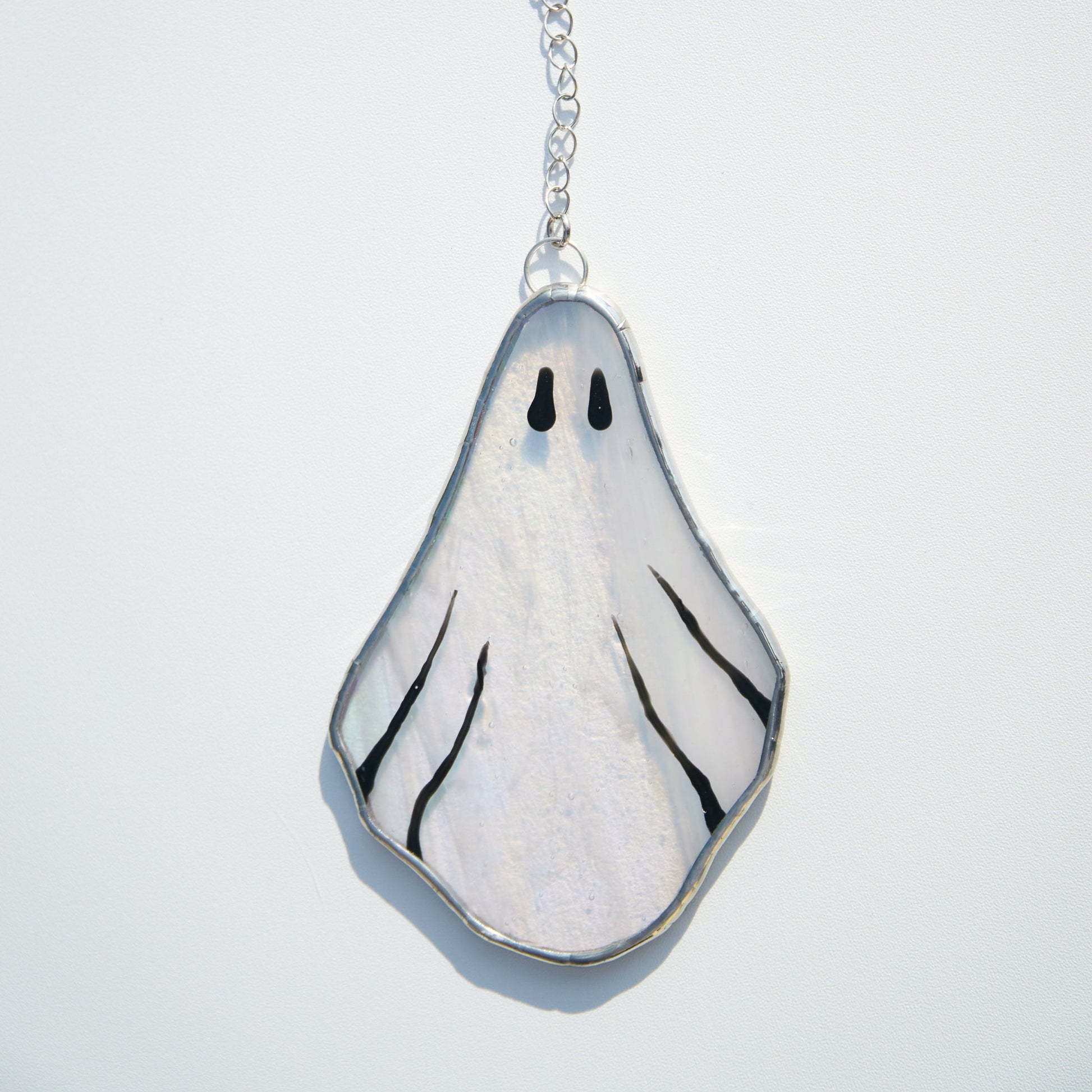 Apportez une touche mystérieuse et envoûtante à votre décoration avec ce vitrail suspendu en forme de fantôme, en verre transparent veiné de blanc et sublimé d’un délicat effet irisé. Son petit prénom : Gédéon !