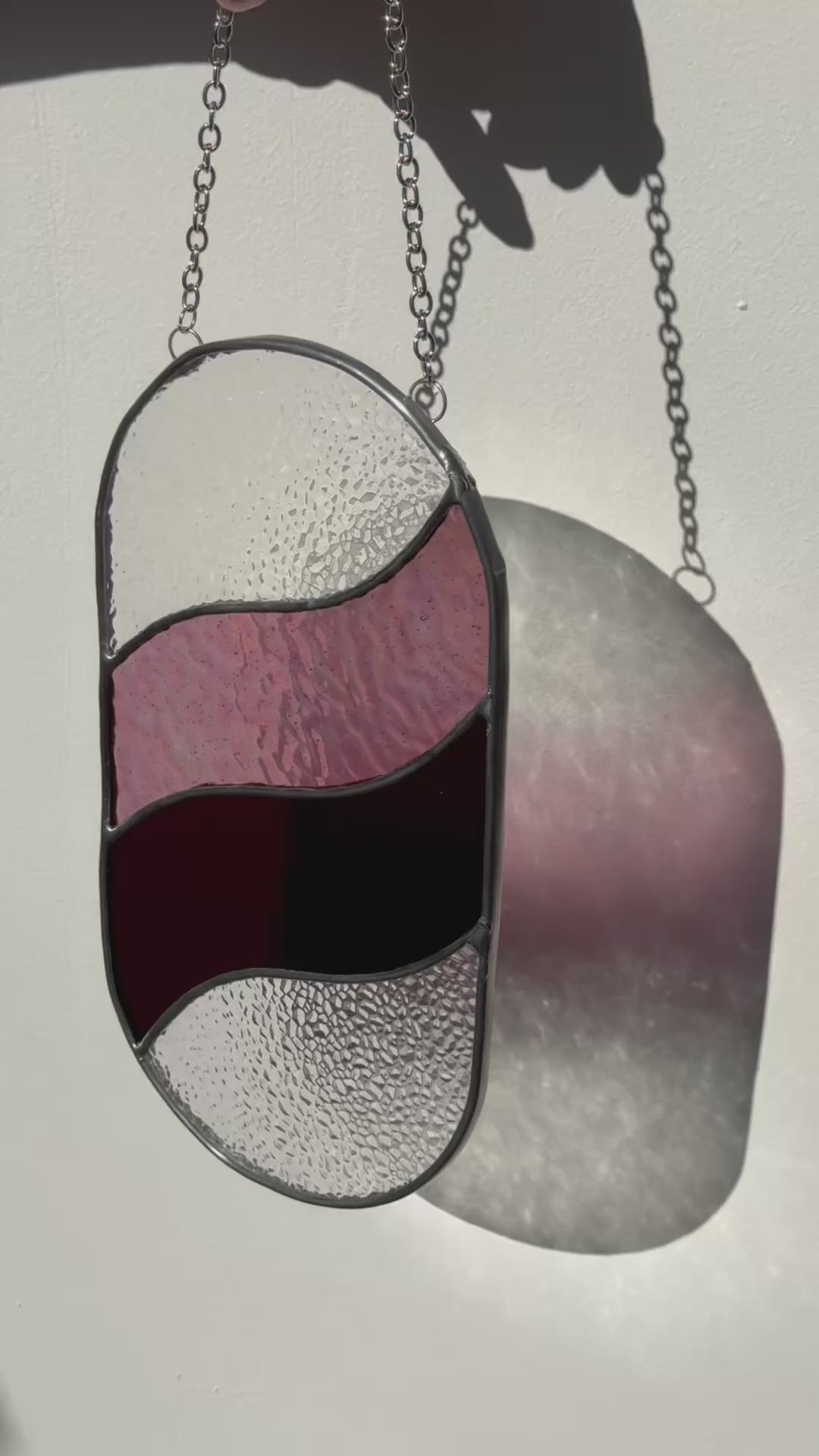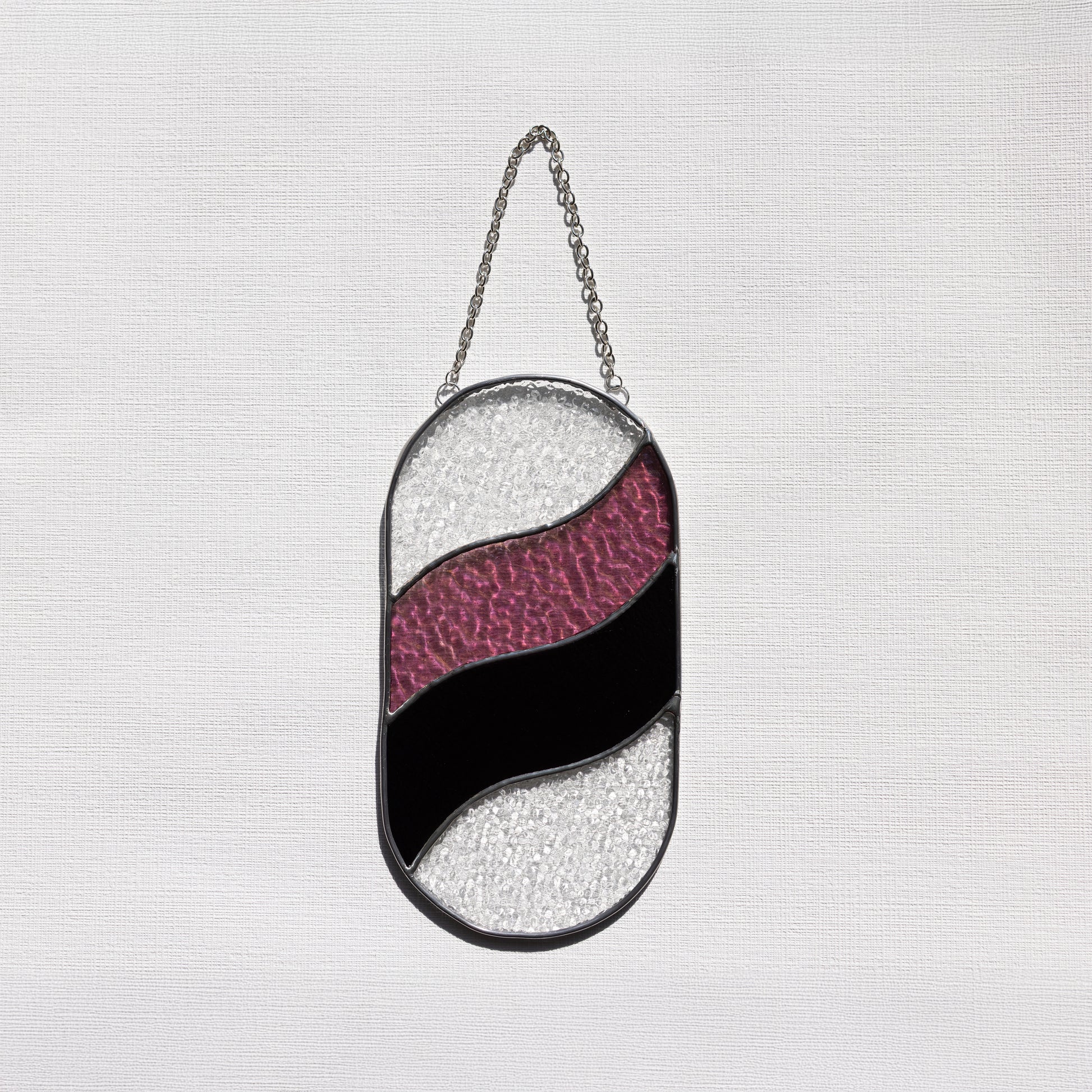 Pièce unique réalisée à la main avec la technique Tiffany, ce vitrail abstrait marie un verre texturé transparent à deux nuances de verre violet, pour un jeu subtil de lumière et de profondeur.